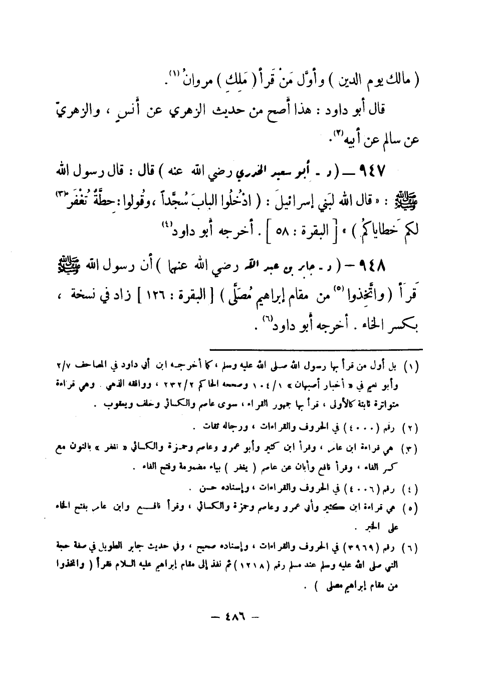 (¬2) رقم (3969) في الحروف والقراءات، وإسناده صحيح، وفي حديث جابر الطويل في صفة حجة النبي صلى الله عليه وسلم عند مسلم رقم (1218) ثم نفذ إلى مقام إبراهيم عليه السلام فقرأ {واتخذوا من مقام إبراهيم مصلى} .