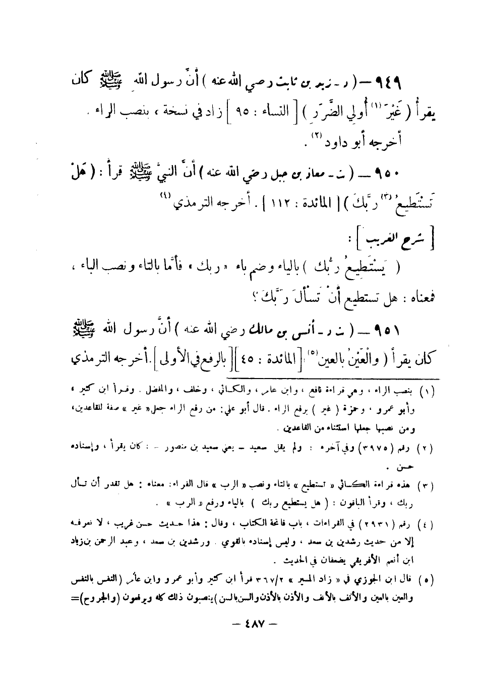 950 - (ت) معاذ بن جبل - رضي الله عنه -: أنَّ النبيَّ صلى الله عليه وسلم قرأَ: {هَلْ تَسْتَطِيعُ (¬1) ربَّكَ} [المائدة: 112] . أخرجه الترمذي (¬2) .