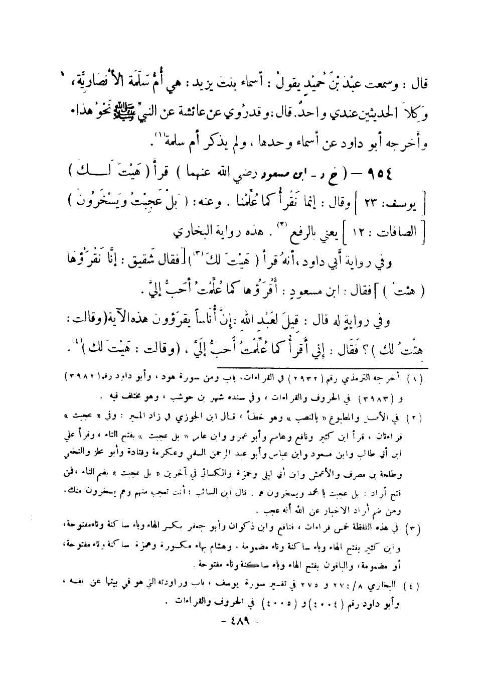 954 - (خ د) ابن مسعود - رضي الله عنهما -: قرأَ {هَيْتَ لَكَ} [يوسف: 23] وقال: إنما نَقْرأُُ كما عُلِّمْنا. وعنه: {بَلْ عَجِبْتُ ويَسْخَرُونَ} [الصافات: 12] يعني بالرفع (¬1) . هذه رواية البخاري.