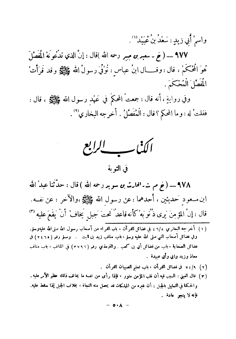 977 - (خ) سعيد بن جبير - رحمه الله -: قال: إنَّ الذي تدْعُونَهُ المُفَصَّلَ هُوَ الْمُحكَمُ، قال: وقال ابنُ عباسٍ: تُوُفِّيَ رسولُ الله صلى الله عليه وسلم وقد قَرَأتُ المُفَصَّل الْمُحْكَمَ.