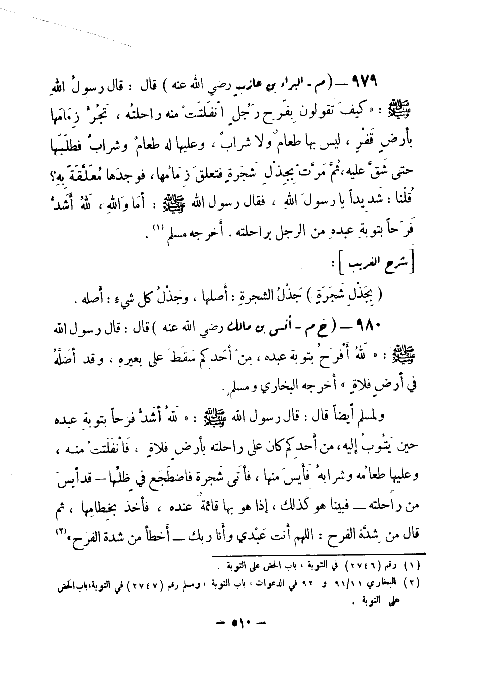 979 - (م) البراء بن عازبٍ - رضي الله عنه -: قال: قال رسول الله صلى الله عليه وسلم: «كَيفَ تقولون بِفَرحِ رَجُلٍ انْفَلتَتْ منه راحلتُه، تَجُرُّ زِمَامَها بأرضٍ قَفْرٍ، ليس بها طعامٌ ولا شرابٌ، وعليها طعامٌ وشرابٌ فطلبَهَا حتى شَقَّ عليه، ثُمَّ مَرَّتْ بِجَذْلِ شَجَرةٍ فتعلقَ زِمَامُها، فوجدَها مُعَلَّقَة بِهِ؟» قُلْنا: شَدِيداً يا رسولَ اللهِ، فقال رسول الله صلى الله عليه وسلم: «أما وَاللهِ، لَلّهُ أَشَدُّ فَرَحاً بتوبةِ عبدهِ من الرجل براحلته» . أخرجه مسلم (¬1) .