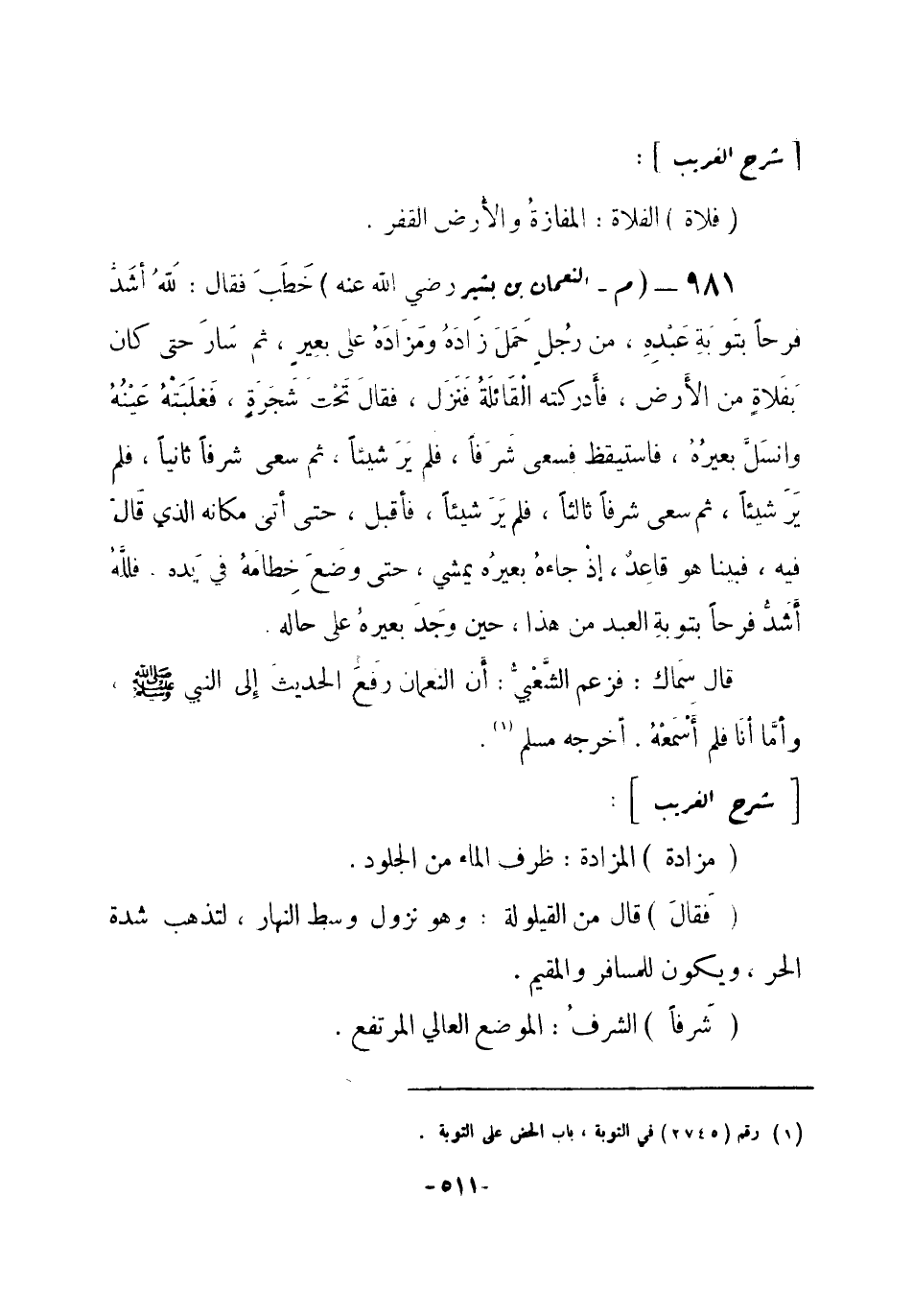 981 - (م) النعمان بن بشير - رضي الله عنه - خَطَبَ فقال: لَلّهُ أشدُّ فرَحاً بتوبة عبده، من رُجلٍ حَمَلَ زَادَهُ ومَزَادَهُ على بعيرٍ، ثم سَارَ حَتّى كان بَفَلاةٍ من الأرض، فأدركته الْقَائلَةُ فَنَزَل، فقال تَحْتَ شَجَرَةٍ، فَغلَبََتْهُ عَيْنُهُ وانسَلَّ بعيرُهُ، فاستيقظ فسعى شَرَفاً، فلم يَرَ شيئاً، ثم سعى شرفاً ثانياً، فلم يَرَ شيئاً، ثم سعى شرفاً ثالثاً، فلم يَر شيئاً، فأقبل، حتى أتى مكانه الذي قَال فيه، فبينا هو قاعِدٌ، إذْ جاءهُ بعيرُه يمشي، حتى وضعَ خطامهُ في يَده، فلَلَّهُ أشَدُّ فرحاً بتوبةِ العبد من هذا، حين وجَدَ بعيرهُ على حاله.