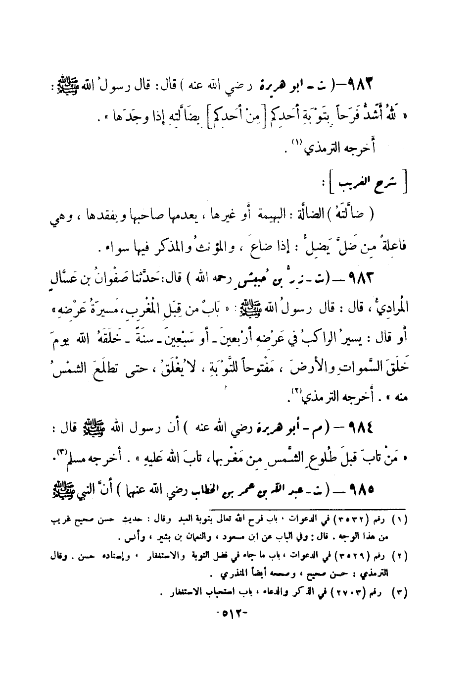 (¬1) رقم (3532) في الدعوات، باب فرح الله تعالى بتوبة العبد، وقال: حديث حسن صحيح غريب من هذا الوجه. وقال: وفي الباب عن ابن مسعود، والنعمان بن بشير، وأنس.
