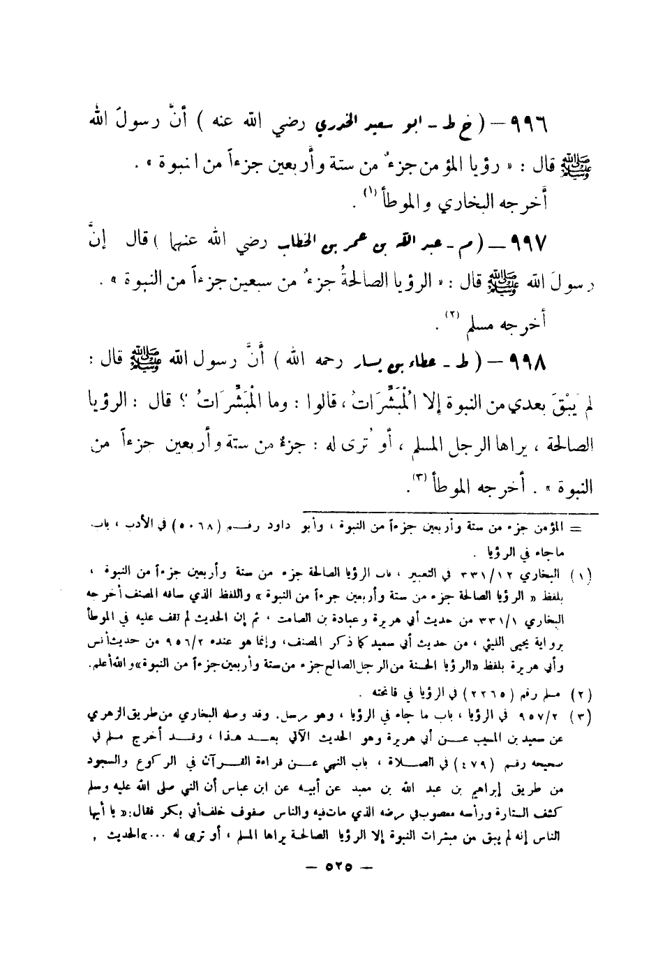 996 - (خ ط) أبو سعيد الخدري - رضي الله عنه -: أَنَّ رسولَ اللهِ صلى الله عليه وسلم قال: «رؤيا المؤمن جزءٌ من سِتَّةٍ وأربعين جزءاً من النبوة» .أخرجه البخاري، والموطأ (¬1) .