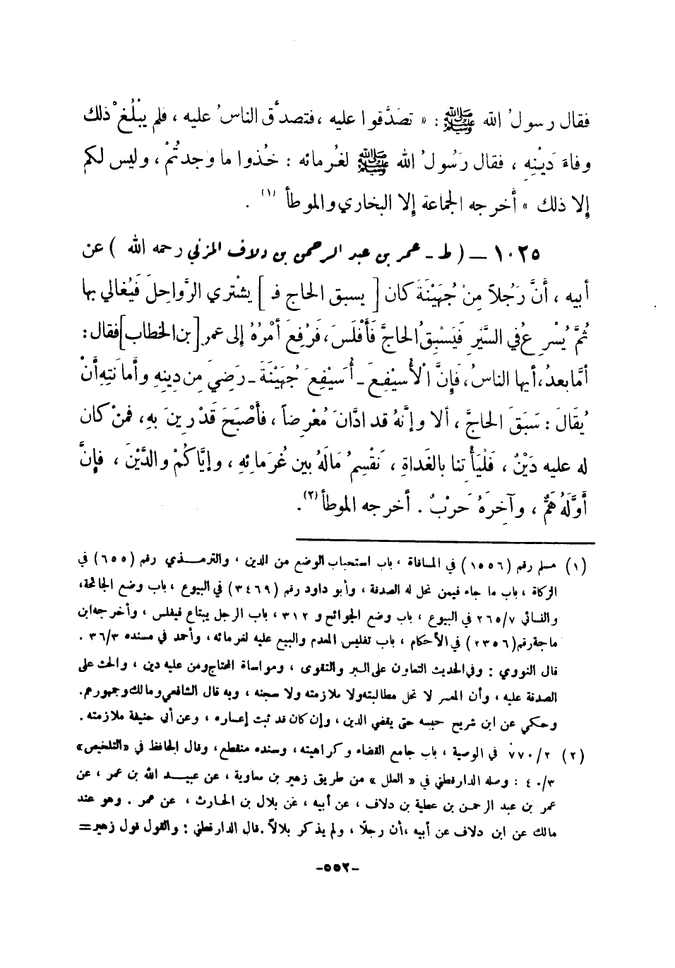 1025 - (ط) عمر بن عبد الرحمن بن دلاف المزني - رحمه الله -: عن أبيه، أنَّ رَجُلاً مِنْ جُهَيْنَةَ كان [يسبق الحاجَّ فـ] يشْتري الرَّواَحل فَيُغالي بها ثُمَّ يُسْرِعُ في السَّيْر فَيَسْبِقُ الحاجَّ فَأَفْلَسَ، فَرُفِعَ أمْرُهُ إلى عمر [بن الخطاب] فقال: أمَّا بعدُ، أيها الناسُ، فَإِنَّ الأُسَيْفِعَ - أُسَيْفِعَ جُهَيْنَةَ- رَضِيَ من دِينِهِ وأَمانَتِهِ أَنْ يُقَالَ: سَبَقَ الحاجَّ، ألا وإنَّهُ قد ادَّانَ مُعْرِضاً، فأصْبَحَ قَدْ رِينَ بهِ، فَمنْ كان له عليه دَيْنٌ، فَلْيَأْتِنا بالغَداةِ، نَقْسِمُ مَالَهُ بين غُرَمائِهِ، وإيَّاكُمْ والدَّيْنَ، فإنَّ أوَّلَهُ هَمٌّ، وآخِرَهُ حَرْبٌ. أخرجه الموطأ (¬1) . -[553]-