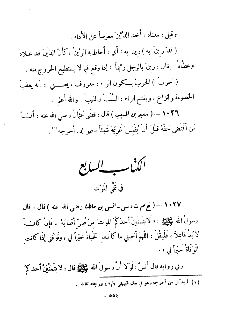 (¬1) البخاري 10 / 107 و 108 في المرضى، باب تمني المريض الموت، وفي الدعوات، باب الدعاء بالموت والحياة، ومسلم رقم (2680) في الذكر والدعاء، باب كراهة تمني الموت، والترمذي رقم (971) في الجنائز، باب في النهي عن تمني الموت، وأبو داود رقم (3108) و (3109) في الجنائز، باب كراهية تمني الموت، والنسائي 4 / 3 في الجنائز، باب تمني الموت.