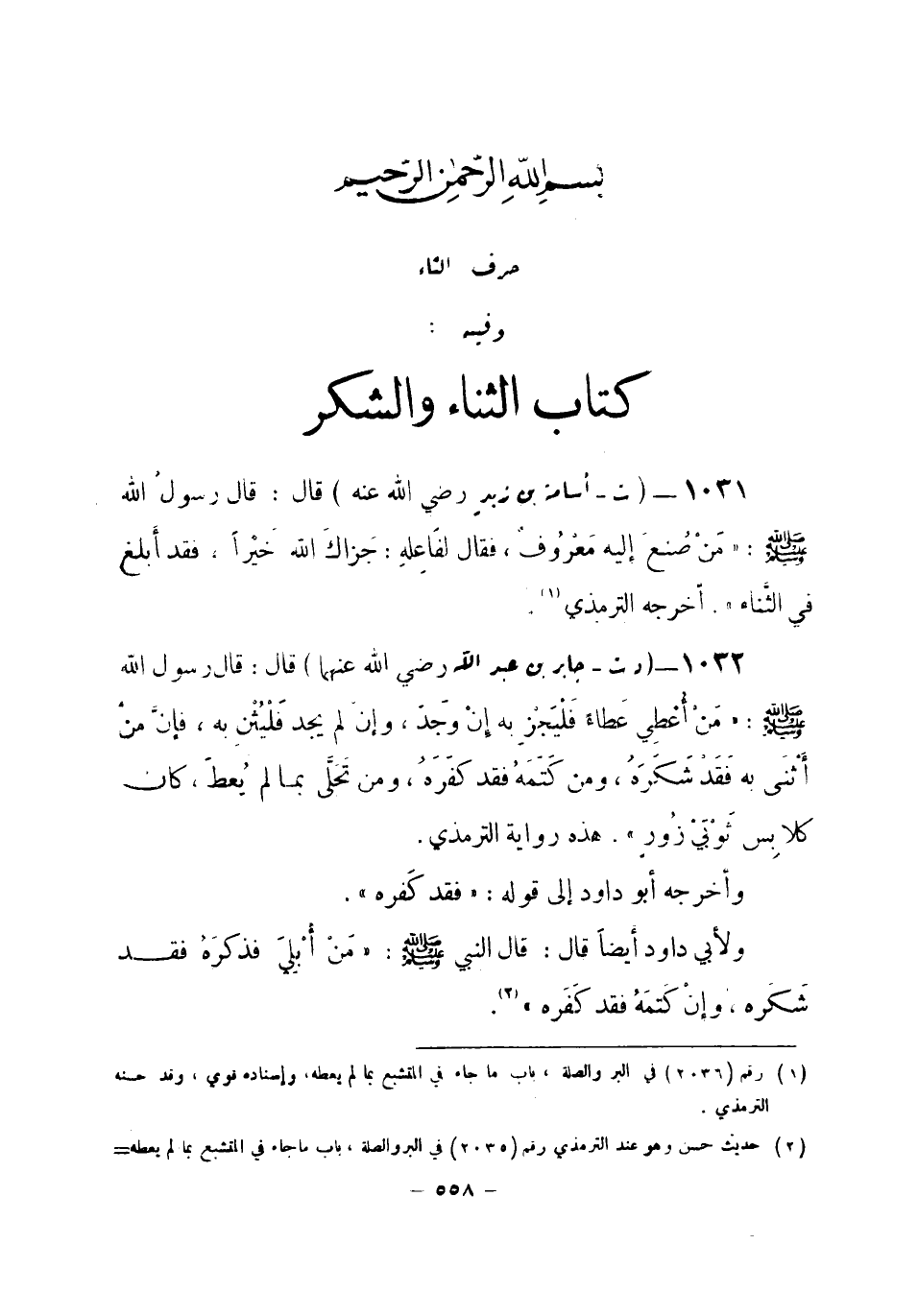 1031 - (ت) أسامة بن زيد - رضي الله عنه -: قال: قال رسول الله صلى الله عليه وسلم: «مَنْ صُنِعَ إليه مَعْرُوفٌ، فقال لفَاعِلهِ: جَزاكَ الله خَيْراً، فقد أبلغ في الثَّناء» . أخرجه الترمذي (¬1) .