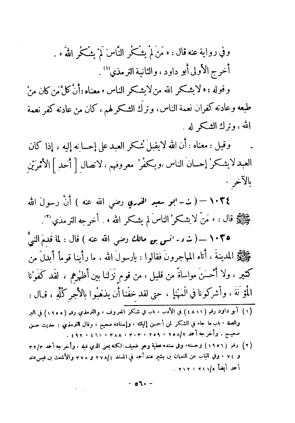 1034 - (ت) أبو سعيد الخدري - رضي الله عنه -: أَنَّ رسولَ اللهِ صلى الله عليه وسلم قال: «مَنْ لا يشْكُر النَّاسَ لَمْ يشْكُر الله» . أخرجه الترمذي (¬1) .