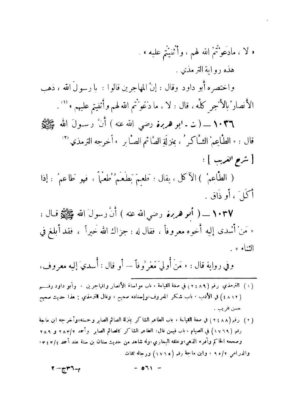 1036 - (ت) أبو هريرة - رضي الله عنه -: أَنَّ رسولَ اللهِ صلى الله عليه وسلم قال: «الطَّاعِمُ الشَّاكِرُ، بمنزلَةِ الصَّائِم الصَّابِرِ» .أخرجه الترمذي (¬1) .