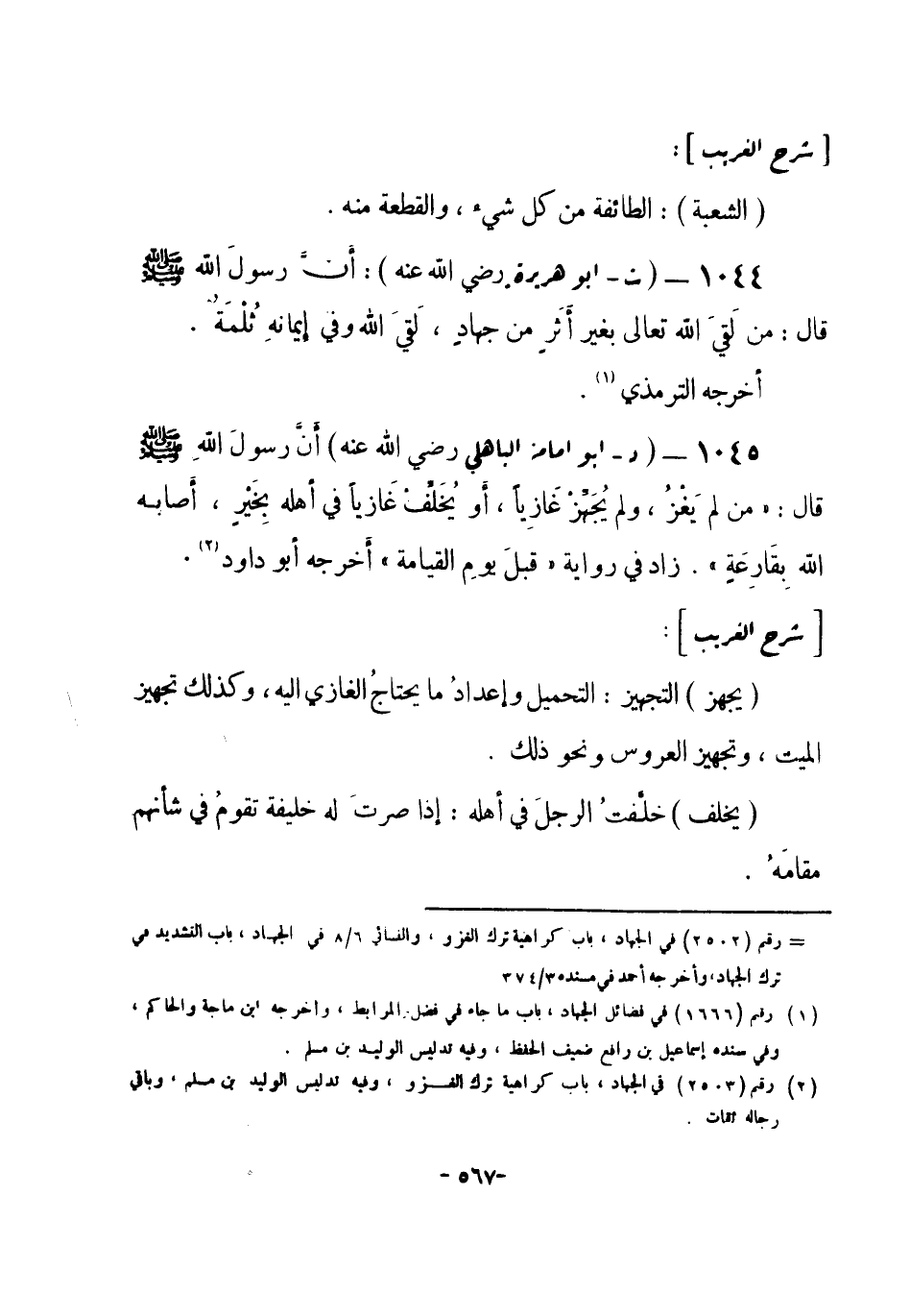 1045 - (د) أبو أمامة الباهلي - رضي الله عنه -: أَنَّ رسولَ اللهِ صلى الله عليه وسلم قال: «من لم يَغْزُ، ولم يُجَهِّزْ غَازِياً، أَو يُخَلِّفْ غَازياً في أهله بِخَيْرٍ، أَصابه اللهُ بِقَارِعَةٍ» .