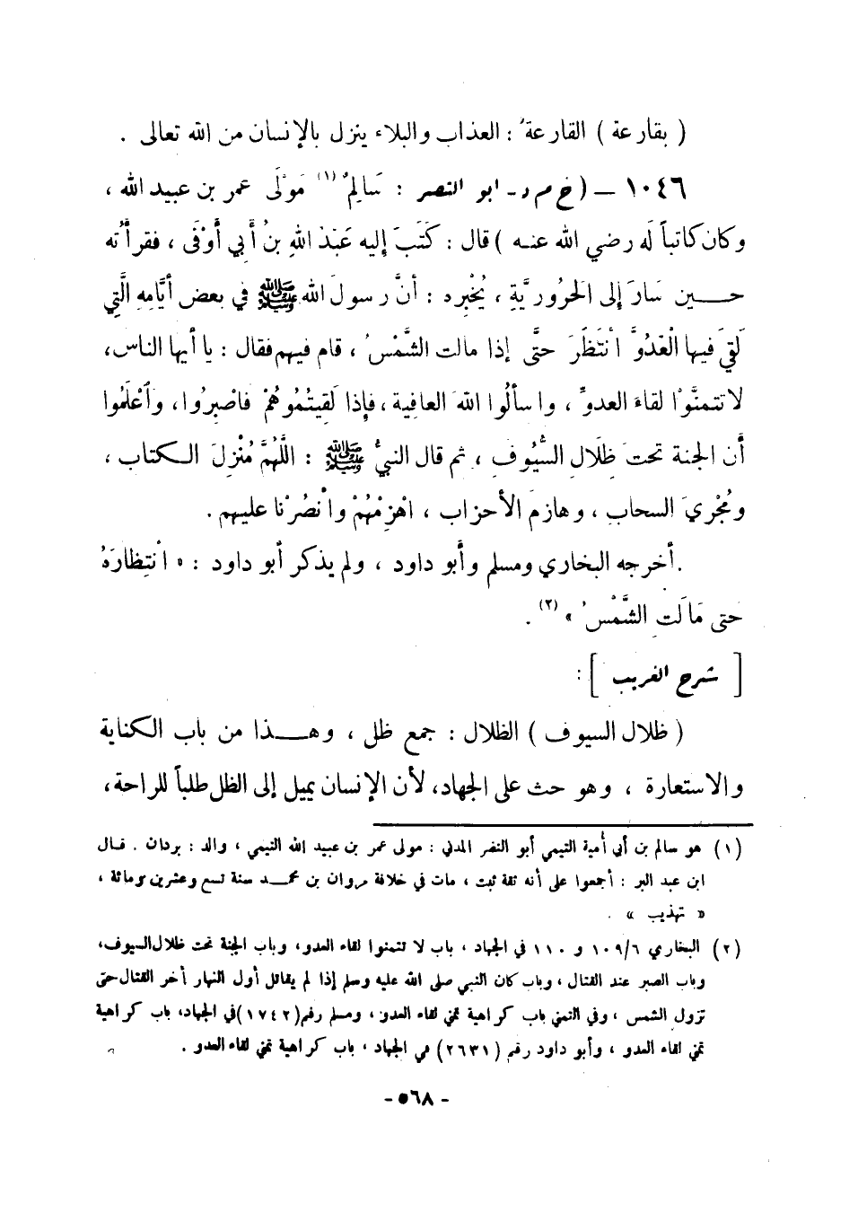 1046 - (خ م د) أبو النصر سَالِمٌ (¬1) مَوْلَى عمر بن عبيد الله، وكان كاتباً لَه - رضي الله عنه- قال: كَتَبَ إليه عَبْدُ اللهِ بنُ أبي أوْفَى، فقرأتُه حين سَارَ إلى الحَرُوريَّةِ، يخبره: أَنَّ رسولَ اللهِ صلى الله عليه وسلم في بعض أيَّامِهِ التي لَقيَ فيها الْعَدُوَّ انْتَظَرَ حتَّى إذا مالت الشَّمْسُ، قام فيهم فقال: «يا أيها الناس، لا تتمنَّوْا لقاءَ العدوِّ، واسألُوا اللهَ العافِية، فإذا لَقِيتُمُوُهمْ فَاصْبِرُوا، وَاعْلَمُوا أن الجنَّة تحتَ ظِلالِ السُّيُوفِ، ثم قال النبيُّ صلى الله عليه وسلم: اللَّهمَّ مُنْزِلَ الكتاب، ومُجْريَ السحاب، وهازمَ الأحزاب، اهْزِمهُمْ وانْصُرْنا عليهم» ، أخرجه البخاري، ومسلم، وأبو داود. ولم يذكر أبو داود «انتِظارَهُ حتى مَالَتِ الشَّمْسُ» (¬2) .