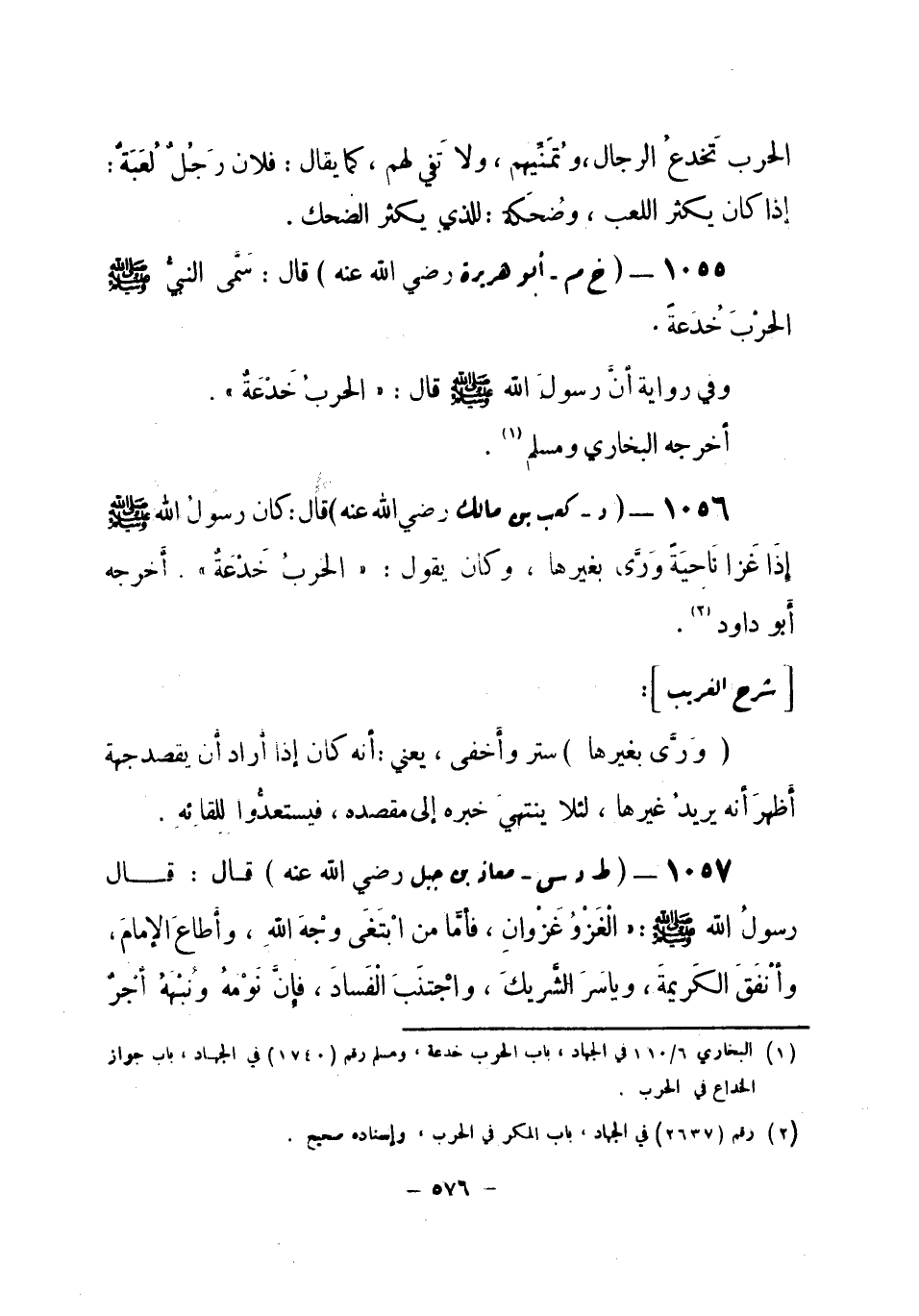 1055 - (خ م) أبو هريرة - رضي الله عنه -: قال: سَمَّى النبيُّ صلى الله عليه وسلم الحرْب خُدَعة.