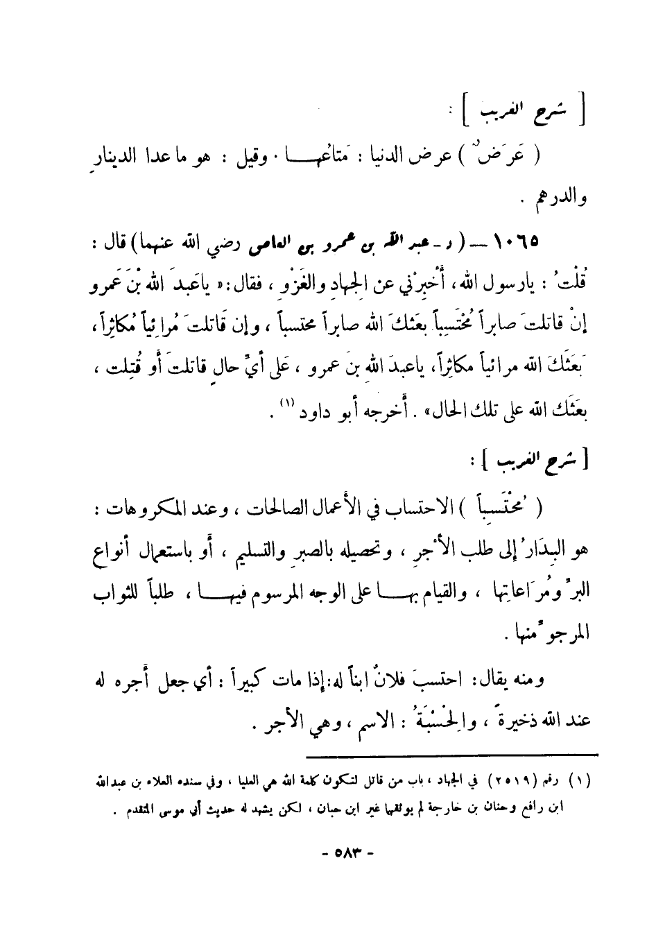1065 - (د) عبد الله بن عمرو بن العاص - رضي الله عنهما -: قال: قُلْتُ: يا رسول الله، أَخْبِرني عن الجِهادِ والغَزْوِ، فقال: «يا عَبدَ الله بْنَ عَمرو إنْ قاتلتَ صابراً مُحتْسِباً بعَثكَ الله صابراً محتسباً، وإن قَاتلتَ مرائياً مُكاثِراً، بَعَثَكَ الله مرائياً مكاثِراً، يا عبدَ اللهِ بنَ عمرو، عَلى أي حالٍ قاتلتَ أو قُتِلت، بعَثَك الله على تلك الحالِ» . أخرجه أبو داود (¬1) .
