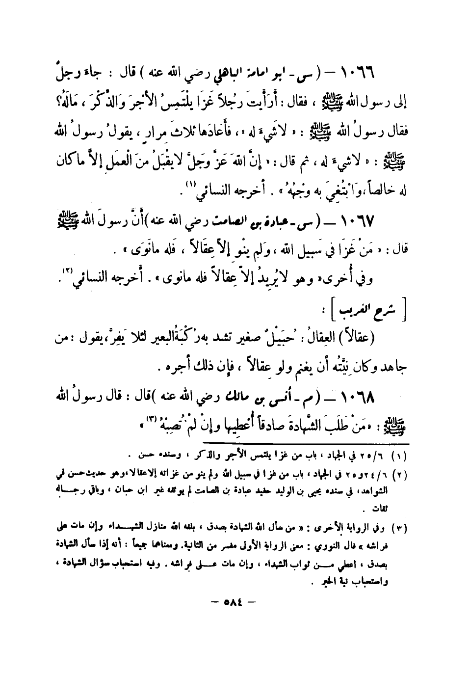 1067 - (س) عبادة بن الصامت - رضي الله عنه -: أَنَّ رسولَ اللهِ صلى الله عليه وسلم قال: «مَنْ غَزَا في سَبيل الله، وَلم ينْوِ إلا عِقَالاً، فَله ما نَوى» .