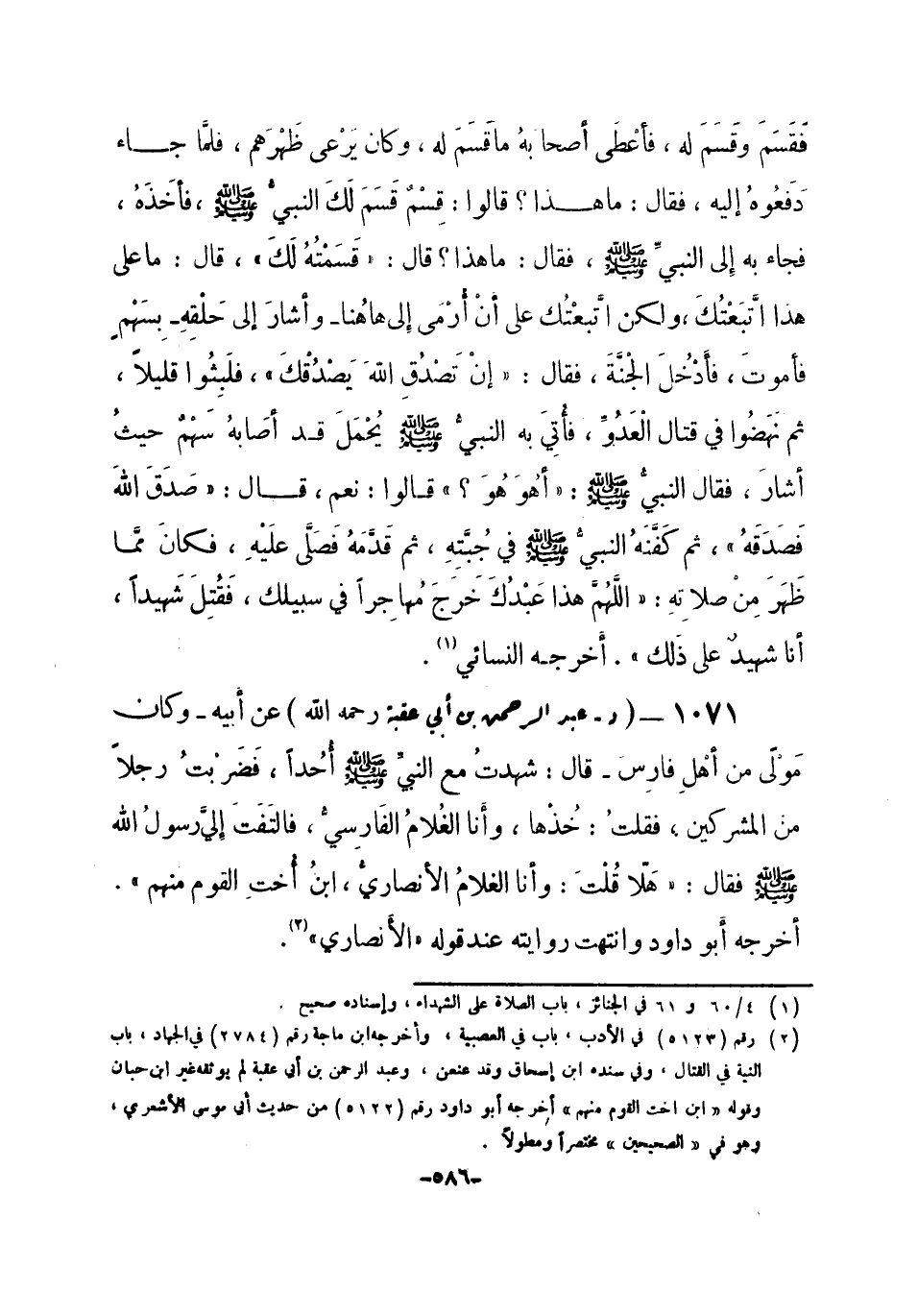 1071 - (د) عبد الرحمن بن أبي عقبة -رحمه الله- عن أبيه: وكان مَوْلى من أهْلِ فارِس - قال: شهدتُ مع النبيِّ صلى الله عليه وسلم أُُحُداً، فَضَرْبتُ رجلاً من المشركين، فقلتُ: خُذْها، وأنا الغُلامُ الفَارِسيُّ، فالتَفَتَ إليَّ رسولُ الله صلى الله عليه وسلم فقال: «هَلاّ قُلْتَ: وأنا الغلامُ الأنصاريُّ، ابنُ أُختِ القوم منهم» .
