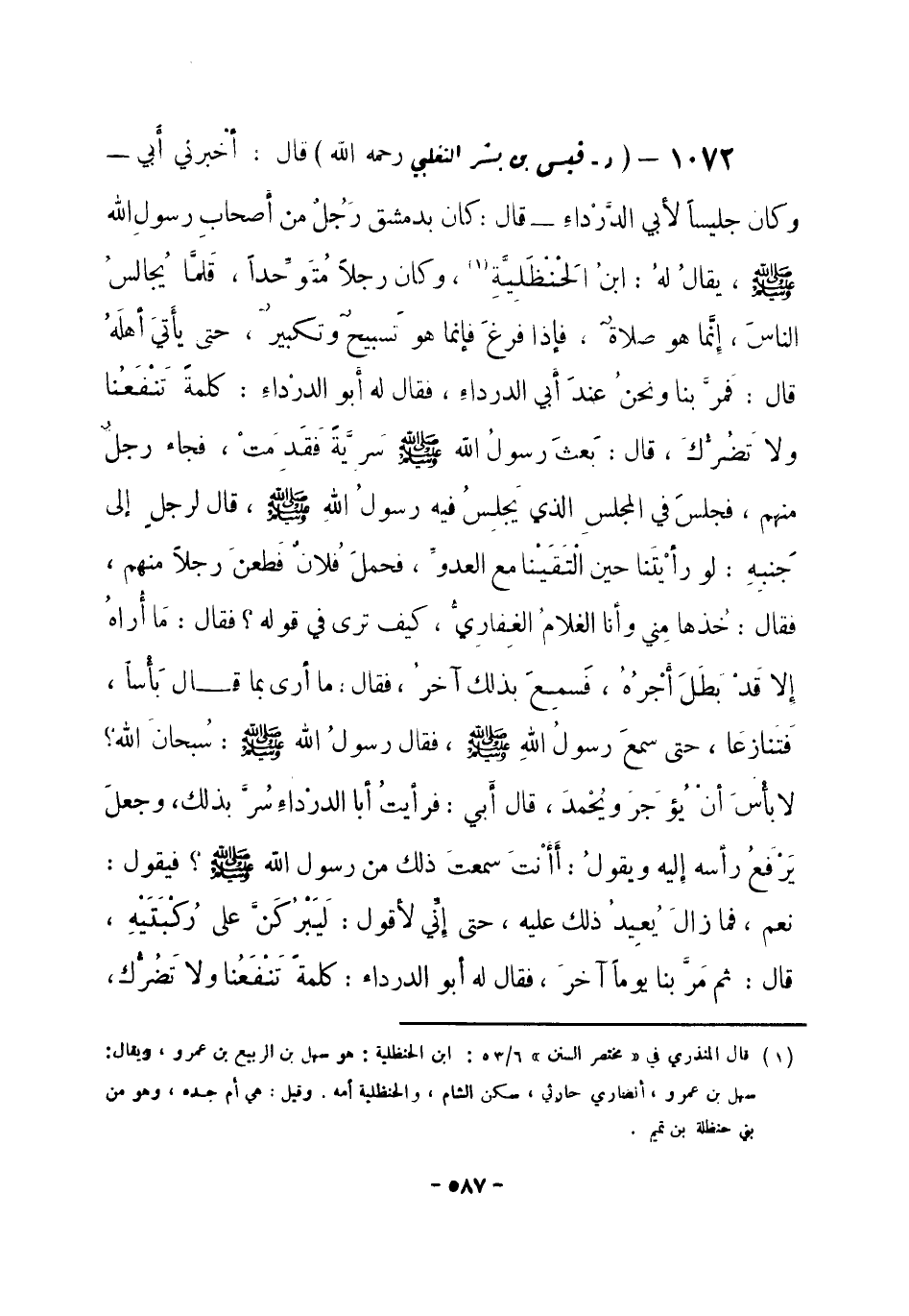 1072 - (د) قيس بن بشر التغلبي - رحمه الله- قال: أخبرني أبي - وكان جليساً لأبي الدَّرْداءِ - قال: كان بدمشق رَجُلٌ من أصحابِ رسولِ الله صلى الله عليه وسلم، يقالُ لهُ: ابنُ الحَنْظَلِيَّةِ (¬1) ، وكان رجلاً مُتَوحِّداً، قَلمَّا يُجالسُ الناسَ، إنمَّا هو صلاةٌ، فإذا فرغَ فإنما هو تَسبيحٌ وتكبيرٌ، حتى يَأْتَي أهلَهُ قال: فَمرَّ بنا ونحنُ عندَ أبي الدرداء، فقال له أبو الدرداء: كلمةً تَنْفَعُنا ولا تَضُرُّكَ، قال: بَعثَ رسولُ الله صلى الله عليه وسلم سَرِيَّة فَقَدِمَتْ، فجاء رجلٌ منهم فجلسَ في المجلسِ الذي يَجلِسُ فيه رسولُ الله صلى الله عليه وسلم، قال لرجلٍ إلى جَنبِهِ: لو رأيْتَنا حين الْتَقَيْنا مع العدوِّ، فحملَ فُلانٌ فَطعنَ رجلاً منهم، فقال: خُذها مِني وأنا الغلامُ الغِفارِيُّ، كيف ترى في قوله؟ فقال: مَا أُراهُ إلا قَدْ بَطَلَ أَجْرُهُ، فَسمِعَ بذلك آخرُ، فقال: ما أرى بما قال بَأْساً، فَتنَازعَا حتى سمعَ رسولُ اللهِ صلى الله عليه وسلم، فقال رسولُ الله صلى الله عليه وسلم: سُبحانَ الله؟ لا بأْسَ أنْ يُؤْجَرَ ويُحْمدَ، قال أبي: فرأيتُ أبا الدرْداءِ سُرَّ بذلك، وجعلَ يَرْفعُ رأسه إليه ويقولُ: أَأَنْتَ سمعتَ ذلك من رسول الله صلى الله عليه وسلم؟ فيقول: نعم فما زالَ يُعيِدُ ذلك عليه، حتى إنِّي لأقول: لَيَبْرُكَنَّ على رُكبتيه، قال: ثم مَرَّ بنا يوماً آخرَ، فقال له أبو الدرداء: كلمةً تَنْفَعُنا ولا تَضُرُّك، -[588]- قال: نَعم، قال لنا رسولُ الله صلى الله عليه وسلم: المُنفِقُ على الخيْلِ، كالبَاسِط يَدَهُ بالصَّدَقَةِ لا يَقْبِضُها، ثُمَّ مَرَّ بنا يوماً آخرَ، فقال له أبو الدرداء: كلمةً تَنفعُنا ولا تضرُّكَ، قال: نعم، قال رسولُ الله صلى الله عليه وسلم نِعمَ الرجلُ خُرَيمٌ الأسدي (¬2) ، لَوْلا طولُ جُمَّتهِ، وإسْبالُ إزارِهِ، فَبَلَغَ ذلك خُريْماً فَعَجلَ وأخذ شفْرةً، فقطع بها جُمَّتهُ إلى أُذُنَيْه، ورفع إزارهُ إلى أنْصَافِ سَاقَيْهِ، ثم مرّ بنا يوماً آخر، فقال له أبو الدرداء: كلمةً تنفعُنا ولا تضرّك، قال: سمعتُ رسول الله صلى الله عليه وسلم يقول: «إنكُم قادِمُونَ على إخوانكم، فَأصْلحُوا رِحَالَكُم، وأصلحوا لِبَاسَكُم، حتى تكونوا كأنَّكم شَامَةٌ في النَّاسِ، فَإنَّ الله لا يُحبُّ الفُحشَ ولا التَّفَحُّشَ» . أخرجه أبو داود (¬3) .