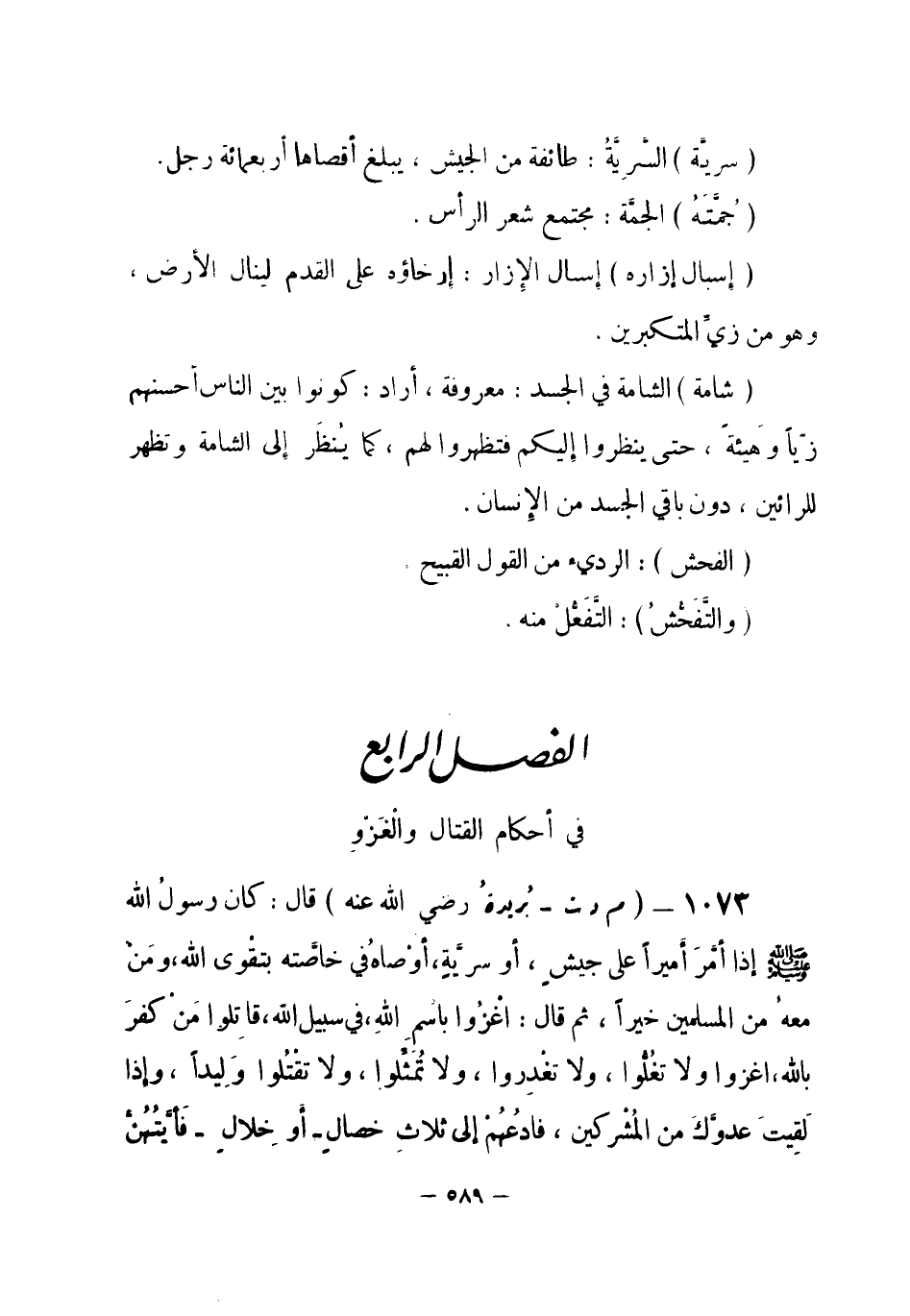 قال: كان رسولُ الله صلى الله عليه وسلم إذا بعثَ أميراً على جَيشٍ أوصاه في خاصَّةِ نفسِهِ بتقوى الله، ومن معه من المسلمين خيراً، فقال: «اغْزُوا باسمِ الله، وفي سبيل الله، قاتِلوا مَنْ كَفَرَ بالله، اغزُوا ولا تغُلُّوا، ولا تغدِرُوا، ولا تُمثِّلوا، ولا تقتُلوا وَليداً» ، قال: وفي الحديث قِصَةٌ.