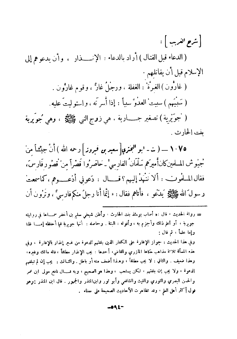 1075 - (ت) أبو البختري [سعيد بن فيروز]- رحمه الله-: أنَّ جيْشاً مِنْ جُيُوش المسلمين كان أَميرهم سَلْمَانُ الفارِسِيُّ - حَاصَرُوا قَصْراً مِنْ قُصُورِ فَارِسَ، فقال المسلمُون: ألاَ ننْهَدُ إليهم؟ قال: دَعوني أدعوهم، كما سمعتُ رسول الله صلى الله عليه وسلم يَدْعُو، فأتاهم فقال: «إنَّما أَنا رجلٌ منكم فارسِيٌّ، وتَرُون أن -[595]- العربَ يُطيعوننِي، فَإنْ أسْلَمْتُم فَلكم مِثْلُ الذي لنا، وعليكم مِثلُ الذي عَليْنَا، وإنْ أبيْتُمْ إلا دِينَكم تَرَكْناكم عليه، وأعطُونا الجزيةَ عن يدٍ وأنتم صاغِرون وَرَطَنَ [إليهم] بِالفارِسِيَّةِ: وأَنتم غَيْرُ مَحُمودِينَ - وإنْ أبيْتُمْ نَابذْناكم على سَوَاءٍ» ، قالوا: ما نحن بالذي نُعطِي الجزْيةَ، ولكنَّا نقاتِلُكُم، قالوا: يا أَبا عبدَ الله، ألا نَنْهَدُ إليهم؟ قال: لا فَدَعاهُمْ ثلاثةَ أَيام إلى مِثْلِ هذا، ثم قال: انْهَدُوا إليهم، فَنَهَدُوا إليهم، فَفَتَحُوا ذلك الْقَصْرَ. أخرجه الترمذي (¬1) .