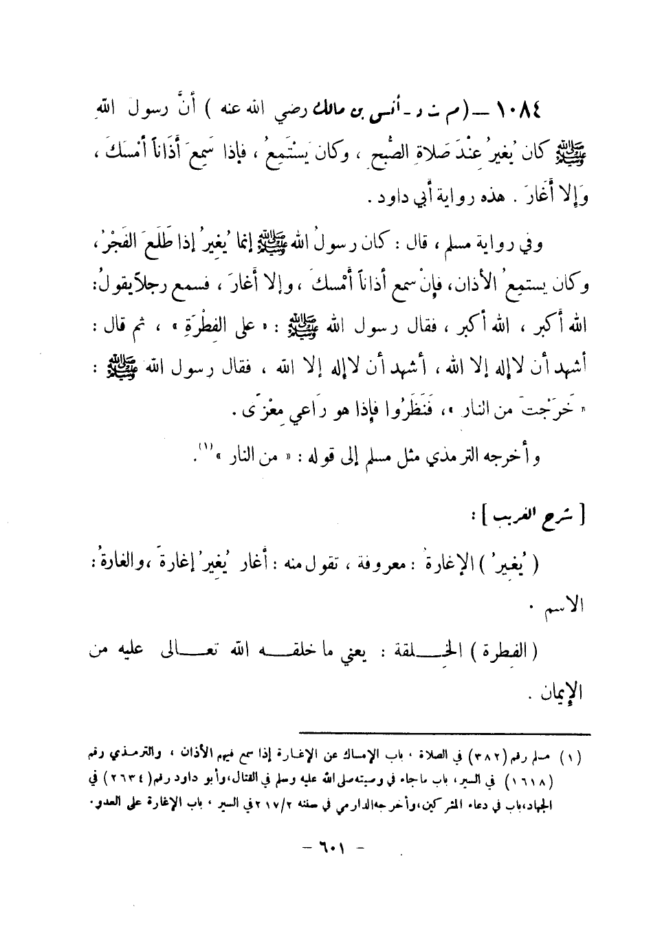 1084 - (م ت د) أنس بن مالك - رضي الله عنه -: أَنَّ رسولَ اللهِ صلى الله عليه وسلم كان يُغيرُ عِنْدَ صَلاةِ الصُّبحِ، وكان يَستْمِعُ، فإذا سَمِع أَذَاناً أمْسَكَ، وَإلاَّ أَغارَ. هذه رواية أبي داود.