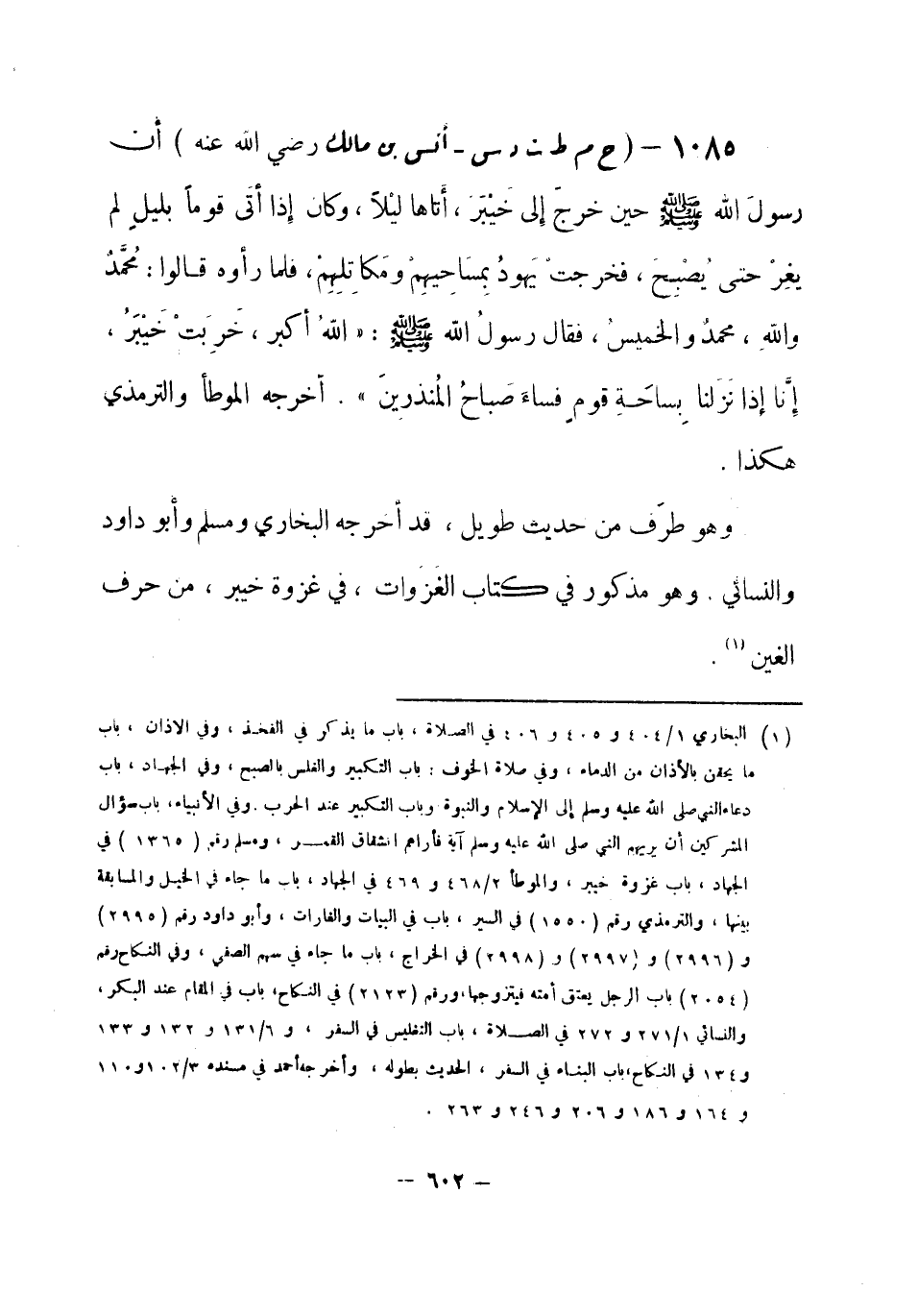 1085 - (خ م ط ت د س) أنس بن مالك - رضي الله عنه -: أَنَّ رسولَ اللهِ صلى الله عليه وسلم حين خرجَ إلى خَيْبَرَ، أَتاها ليْلاً، وكان إذا أتَى قوماً بليلٍ لم يغِرْ حتى يُصْبِحَ، فخرجتْ يَهودُ بِمسَاحِيهِمْ ومَكاتِلِهِمْ، فلما رأوه قالوا: مُحمَّدٌ واللهِ، محمدٌ والخميسُ، فقال رسولُ الله صلى الله عليه وسلم: «اللهُ أكبر، خَرِبَتْ خَيْبَرُ، إِنَّا إذا نَزَلنَا بِساحَةِ قومٍ فساءَ صَباحُ المُنذرِينَ» . أخرجه الموطأ والترمذي هكذا.