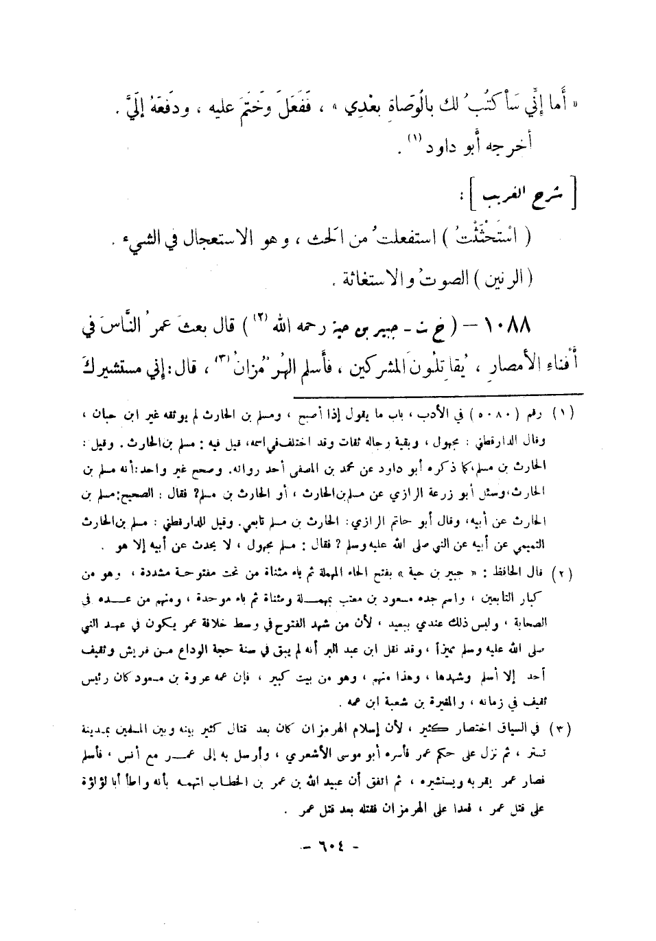 (¬1) قال الحافظ: " جبير بن حية " بفتح الحاء المهملة ثم ياء مثناة من تحت مفتوحة مشددة، وهو من كبار التابعين، واسم جده مسعود بن معتب بمهملة ومثناة ثم باء موحدة، ومنهم من عده في الصحابة وليس ذلك عندي ببعيد، لأن من شهد الفتوح في وسط خلافة عمر يكون في عهد النبي صلى الله عليه وسلم مميزاً، وقد نقل ابن عبد البر أنه لم يبق في سنة حجة الوداع من قريش وثقيف أحد إلا أسلم وشهدها وهذا منهم، وهو من بيت كبير فإن عمه عروة بن مسعود كان رئيس ثقيف في زمانه، والمغيرة بن شعبة ابن عمه.