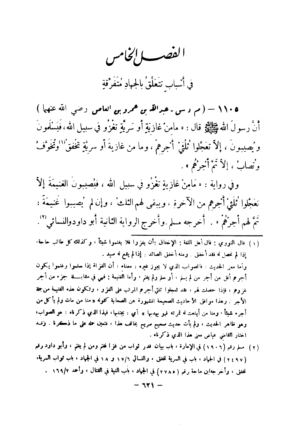 (¬2) مسلم رقم (1906) في الإمارة، باب بيان قدر ثواب من غزا فغنم ومن لم يغنم، وأبو داود رقم (2497) في الجهاد، باب في السرية تخفق، والنسائي 6 / 17 و 18 في الجهاد، باب ثواب السرية تخفق، وأخرجه ابن ماجة رقم (2785) في الجهاد، باب النية في القتال، وأحمد 2 / 169.