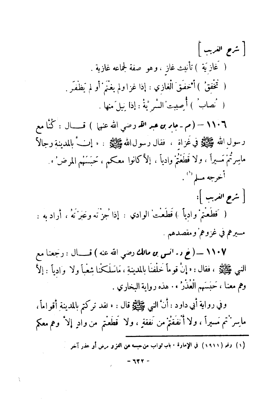 1107 - (خ د) أنس بن مالك - رضي الله عنه -: قال: رجَعْنا مع النبي صلى الله عليه وسلم، فقال: «إنَّ قوْماً خَلْفنَا بالمدينةِ، مَا سَلَكنْا شِعْباً، ولا وَادِياً: إلا وهم معنا، حَبَسَهُم الْعُذْرُ» . هذه رواية البخاري.