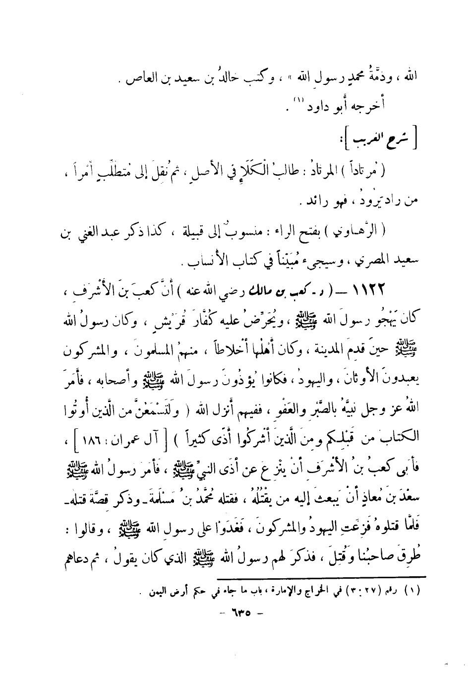 1122 - (د) كعب بن مالك - رضي الله عنه -: أنَّ كعب بن الأشرف، كان يَهْجُو رسولَ الله صلى الله عليه وسلم، ويُحَرِّضُ عليه كُفَّارَ قُرَيْشٍ، وكان رسولُ الله صلى الله عليه وسلم حينَ قدِمَ المدينة، وكان أَهْلُها أَخْلاطاً، منهم المُسْلمون، والمشركون يعبدونَ الأوثانَ، واليهودُ، فكانوا يُؤْذُونَ رسولَ الله صلى الله عليه وسلم وأصحابه، فأمَرَ اللهُ عز وجل نبيَّهُ بالصَّبْرِ والعَفْوِ، ففيهم أنزل الله {ولَتَسْمَعُنَّ من الَّذين أُوتُوا الكتابَ من قَبْلِكم ومِنَ الَّذينَ أشْركُوا أَذًى كثيراً} [آل عمران: 186] ، فأبَى كعب بن الأشرف أنْ ينْزِعَ عن أذَى النبيِّ صلى الله عليه وسلم، فَأمَرَ رسولُ الله صلى الله عليه وسلم سعْدَ بن معاذٍ أنْ يَبعثَ إليه من يقْتُلُهُ فقتله محمد بن مسلمة - وذكر قصَّةَ قتله - فَلمَّا قتلوهُ فَزِعتِ اليهودُ والمشركونَ، فَغَدَوْا على رسولِ الله صلى الله عليه وسلم، وقالوا: طُرِقَ صاحبُنا وَقُتِلَ، فذكرَ لهم رسولُ الله صلى الله عليه وسلم الذي كان يقولُ، ثم دعاهم -[636]- إلى أن يَكتُبَ بينه وبينهم كتاباً، ينتهون إلى ما فيه، فكتبَ بينه وبينهم وبين المسلمين عَامَّة صَحيفَة. أخرجه أبو داود (¬1) .