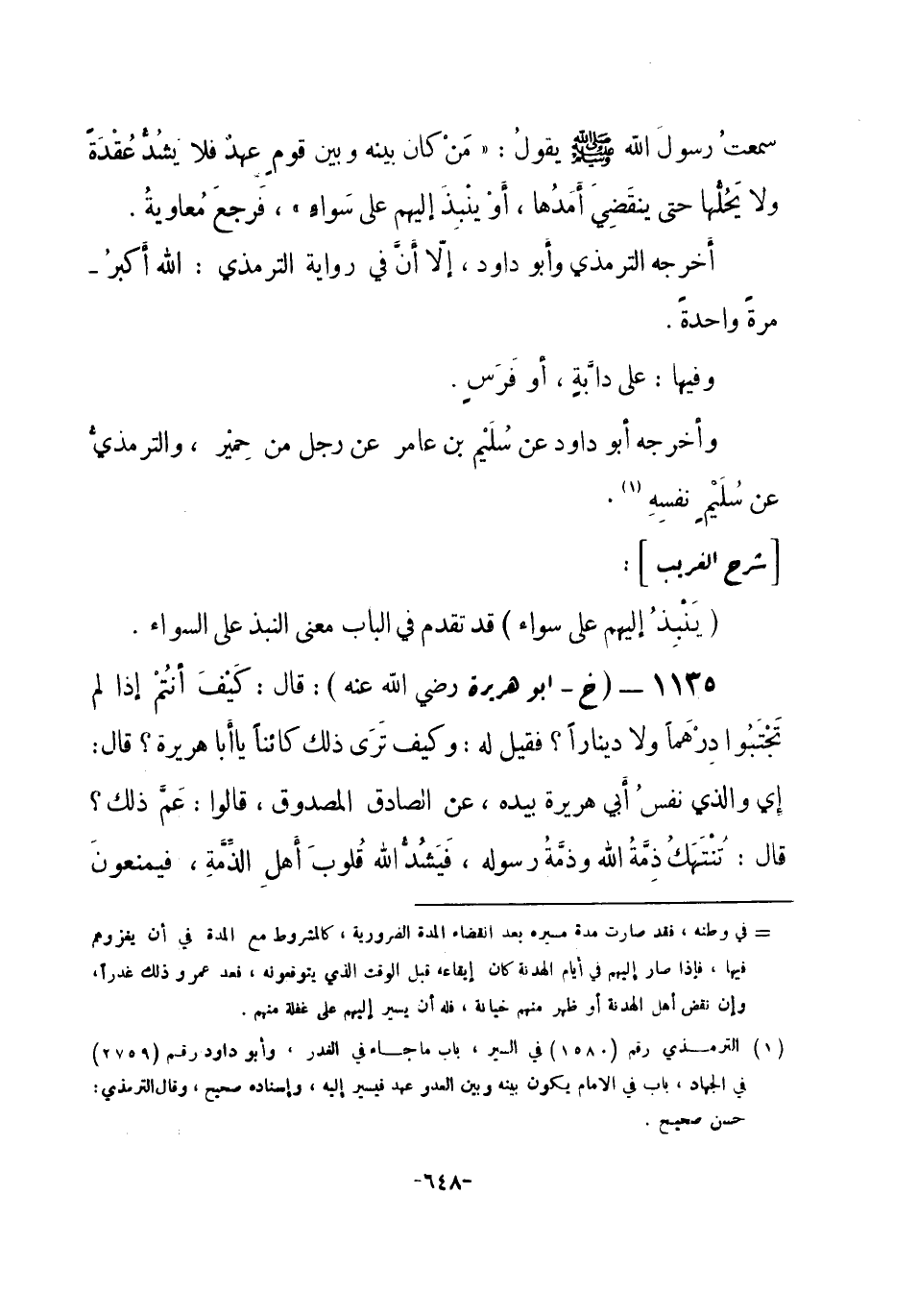 1135 - (خ) أبو هريرة - رضي الله عنه -: قال: كَيْفَ أنُتْم إذا لم تَجْتَبُوا دِرْهماً ولا ديناراً؟ فقيل له: وكيف تَرَى ذلك كائناً يا أبا هريرة؟ قال: إي والذي نفسُ أبي هريرة بيده، عن الصادق المصدوق، قالوا: عَمَّ ذلك؟ قال: تُنْتَهَكُ ذِمَّةُ الله وذمَّةُ رسوله، فَيَشُدُّ الله قُلوبَ أهلِ الذِّمَّةِ، فيمنعونَ -[649]- ما في أيديهم (¬1) . أخرجه البخاري (¬2) .