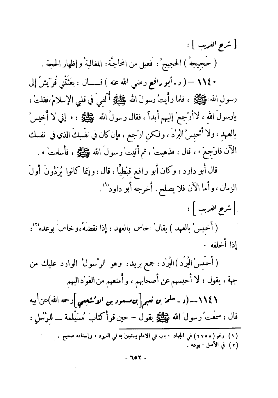 1140 - (د) أبو رافع - رضي الله عنه -: قال: بعثَتني قُرَيشٌ إلى رسولِ الله صلى الله عليه وسلم، فلما رأيتُ رسولَ الله صلى الله عليه وسلم أُلقِيَ في قلبي الإسلامُ، فقلتُ: يا رسول اللهِ، لا أرْجِعُ إليهم أبداً، فقال رسولُ الله صلى الله عليه وسلم: «إني لا أخِيسُ بالعهدِ، ولا أحْبِسُ البُرُدَ، ولكنِ ارْجع، فإن كان في نَفْسِكَ الذي في نفسك الآن فارْجِعْ» ، قال: فذهبتُ، ثم أتيتُ رسولَ الله صلى الله عليه وسلم، فأسلمتُ.