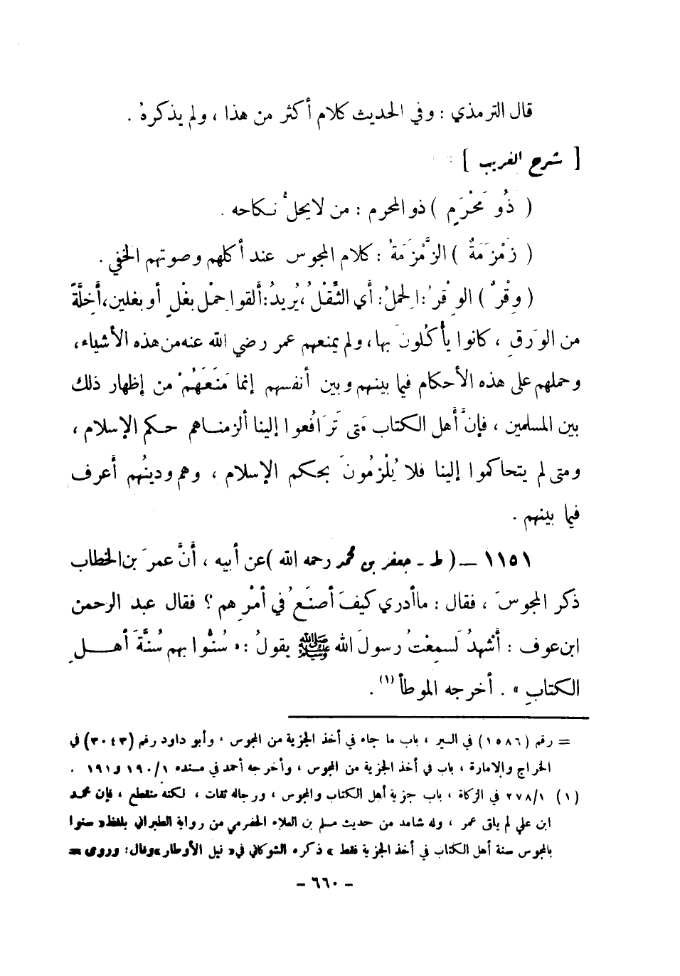 1151 - (ط) جعفر بن محمد - رحمه الله-: عن أبيه أنَّ عمرَ بن الخطاب ذكر المجوسَ، فقال: مَا أدري كيف أصنَعُ في أمرِهم؟ فقال عبد الرحمن بن عوف: أشهدُ لَسمِعْتُ رسولَ الله صلى الله عليه وسلم يَقُولُ: «سُنُّوا بهم سُنَّةَ أَهلِ الكتابِ» . أخرجه الموطأَ (¬1) . -[661]-