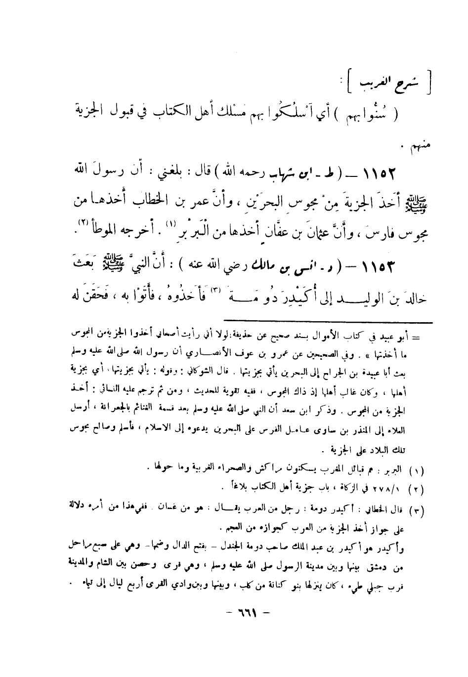 1152 - (ط) ابن شهاب - رحمه الله -: قال: بَلَغَنِي: أَنَّ رسولَ اللهِ صلى الله عليه وسلم أخذَ الجزيةَ مِنْ مجوسِ البَحْرَيْنِ، وأنَّ عمر بن الخطاب أخذها من مجوس فارسَ، وأنَّ عثمانَ بن عفَّانَ أخذها من البَرْبِر (¬1) . أخرجه الموطأ (¬2) .