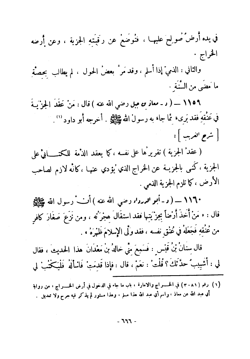 1160 - (د) أبو الدرداء - رضي الله عنه -: أَنَّ رسولَ اللهِ صلى الله عليه وسلم قال: «مَنْ أَخَذَ أَرْضاً بِجِزْيَتِها فقد استقَالَ هِجْرَتُه، ومن نَزَعَ صَغَارَ كافرٍ من عُنُقِهِ فَجَعَلهُ في عُنُقِ نفسه، فقد وَلَّى الإسلامَ ظَهْرَهُ» .