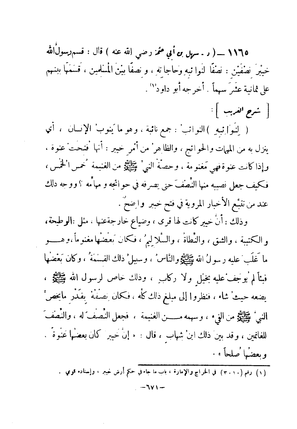 1165 - (د) سهل بن أبي حَثَمَة - رضي الله عنه -: قال: قسم رسولُ الله خَيْبَرَ نِصْفَيْنِ: نصْفاً لِنَوائبِهِ وَحاجاتِهِ، ونِصفاً بيْنَ المُسْلِمين، قَسَمَهَا بينهم على ثمانية عَشَر سهماً. أخرجه أبو داود (¬1) .