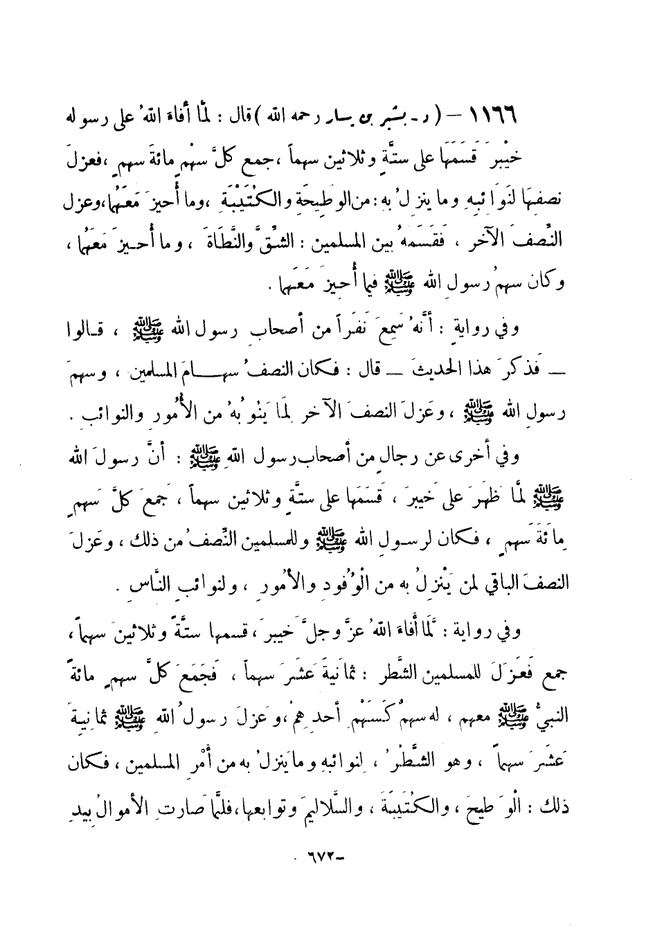 1166 - (د) بشير بن يسار - رحمه الله -: قال: لمَّا أفاءَ اللهُ على رسوله خيْبرَ قَسَمَهَا على ستةٍ وثلاثين سهماً، جمعَ كلَّ سهْمٍ مائةَ سهمٍ، فعزلَ نصفِهَا لنَوَائِبِهِ، وما ينزلُ بهِ: من الوَطِيحَةِ، والكُتَيْبَةِ، وما أحيزَ مَعَهُما، وعزل النِّصفَ الآخر، فَقَسَمَهُ بين المسلمين: الشِّقَّ، والنَّطَاةَ، وما أُحيزَ مَعَهما، وكان سهمُ رسولِ الله صلى الله عليه وسلم فيما أُحيِزَ معَهُما.
