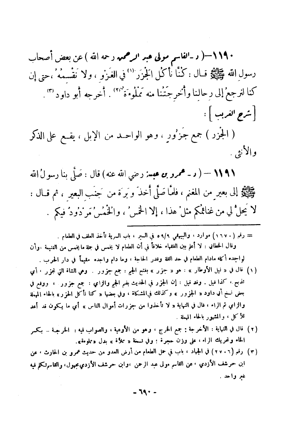 (¬3) رقم (2706) في الجهاد، باب في حمل الطعام من أرض العدو من حديث عمرو بن الحارث، عن ابن حرشف الأزدي، عن القاسم مولى عبد الرحمن، وابن حرشف الأزدي مجهول، والقاسم تكلم فيه غير واحد.