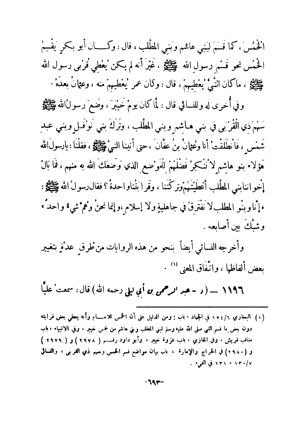 1196 - (د) عبد الرحمن بن أبي ليلى -رحمه الله-: قال: سمعتُ عليًّا -[694]- يقولُ: ولأني رسولُ الله صلى الله عليه وسلم على خُمُسِ الخُمُسِ، فوضعتُه مواضِعَهُ حياتَهُ وحياةَ أبي بكرٍ، وحياةَ عمر، فأُتِي عمرُ بمالٍ آخرَ حياتِهِ، فدعاني، فقال: خُذه، فقلتُ: لا أُرِيدُهُ، فقال: خُذْهُ، فأنتم أحقُّ به، قلتُ: قد اسْتَغْنَيْنا عنه، فجعله في بيت المال.