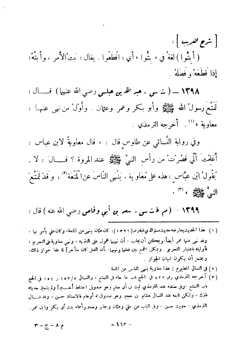 1398 - (ت س) عبد الله بن عباس -رضي الله عنهما- قال «: تَمتَّعَ رسولُ الله -صلى الله عليه وسلم- وأبو بكر وعمر وعثمان، وأوَّلُ من نهى عنها: معاوية» (¬1) . أخرجه الترمذي