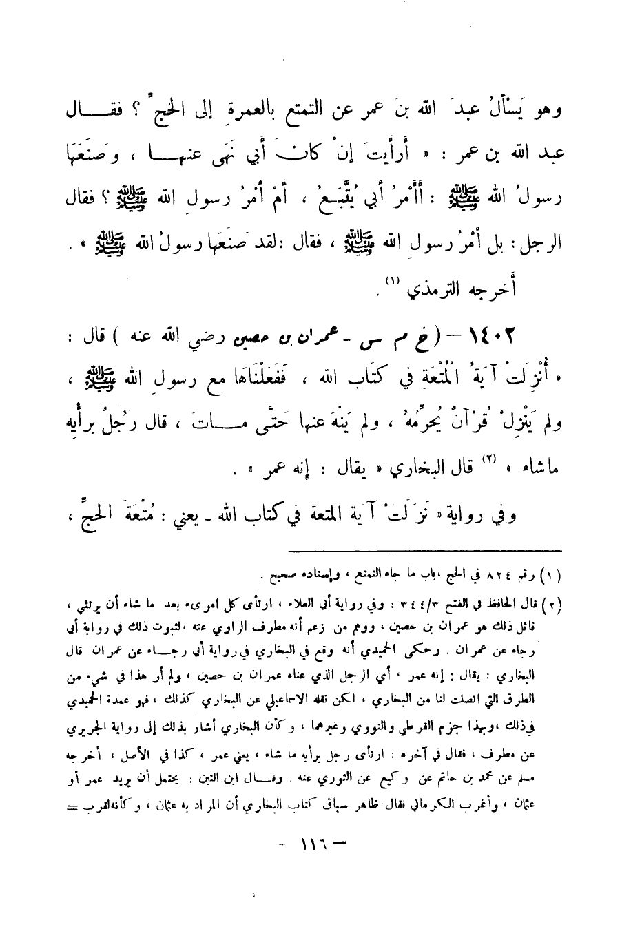 (¬1) قال الحافظ في " الفتح " 3 / 344: وفي رواية أبي العلاء، ارتأى كل امرئ بعد ما شاء أن يرتئي، قائل ذلك هو عمران بن حصين، ووهم من زعم أنه مطرف الراوي عنه، لثبوت ذلك في رواية أبي رجاء عن عمران. وحكى الحميدي أنه وقع البخاري في رواية أبي رجاء عن عمران قال البخاري: يقال: إنه عمر، أي الرجل الذي عناه عمران بن حصين، ولم أر هذا في شيء من الطرق التي اتصلت لنا من البخاري، لكن نقله الإسماعيلي عن البخاري كذلك، فهو عمدة الحميدي في ذلك، وبهذا جزم القرطبي والنووي وغيرهما، وكأن البخاري أشار بذلك إلى رواية الجريري عن مطرف فقال في آخره: ارتأى رجل برأيه ما شاء، يعني عمر، كذا في الأصل، أخرجه مسلم عن محمد بن حاتم عن وكيع عن الثوري عنه. وقال ابن التين: يحتمل أن يريد عمر أو عثمان، وأغرب الكرماني فقال: ظاهر سياق كتاب البخاري أن المراد به عثمان، وكأنه لقرب -[117]- عهده بقصة عثمان مع علي جزم بذلك، وذلك غير لازم، فقد سبقت قصة عمر مع أبي موسى في ذلك، ووقعت لمعاوية أيضاً مع سعد بن أبي وقاص في صحيح مسلم قصة في ذلك، والأولى أن يفسر بعمر، فإنه أول من نهى عنها، وكأن من بعده كان تابعاً له في ذلك، وفي مسلم أيضاً أن ابن الزبير كان ينهى عنها، وابن عباس يأمر بها، فسألوا جابراً فأشار إلى أن أول من نهى عنها عمر، ثم في حديث عمران هذا ما يعكر على عياض وغيره في جزمهم أن المتعة التي نهى عنها عمر وعثمان هي فسخ الحج إلى العمرة، لا العمرة التي يحج بعدها، فإن في بعض طرقه عند مسلم التصريح بكونها متعة الحج، وفي رواية له أيضاً أن رسول الله صلى الله عليه وسلم أعمر بعض أهله في العشر. وفي رواية له: جمع بين حج وعمرة، ومراده التمتع المذكور وهو الجمع بينهما في عام واحد.