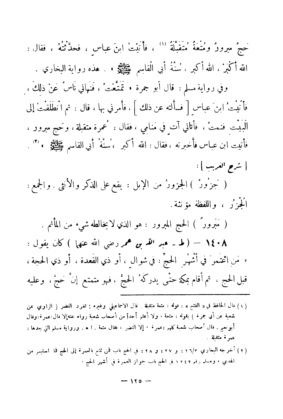 (¬1) 1 / 344 في الحج، باب ما جاء في التمتع، وإسناده صحيح، وفي حديث ابن عمر هذا مبالغة في جواز التمتع، وفيه رد على أبيه وعثمان في كراهته.