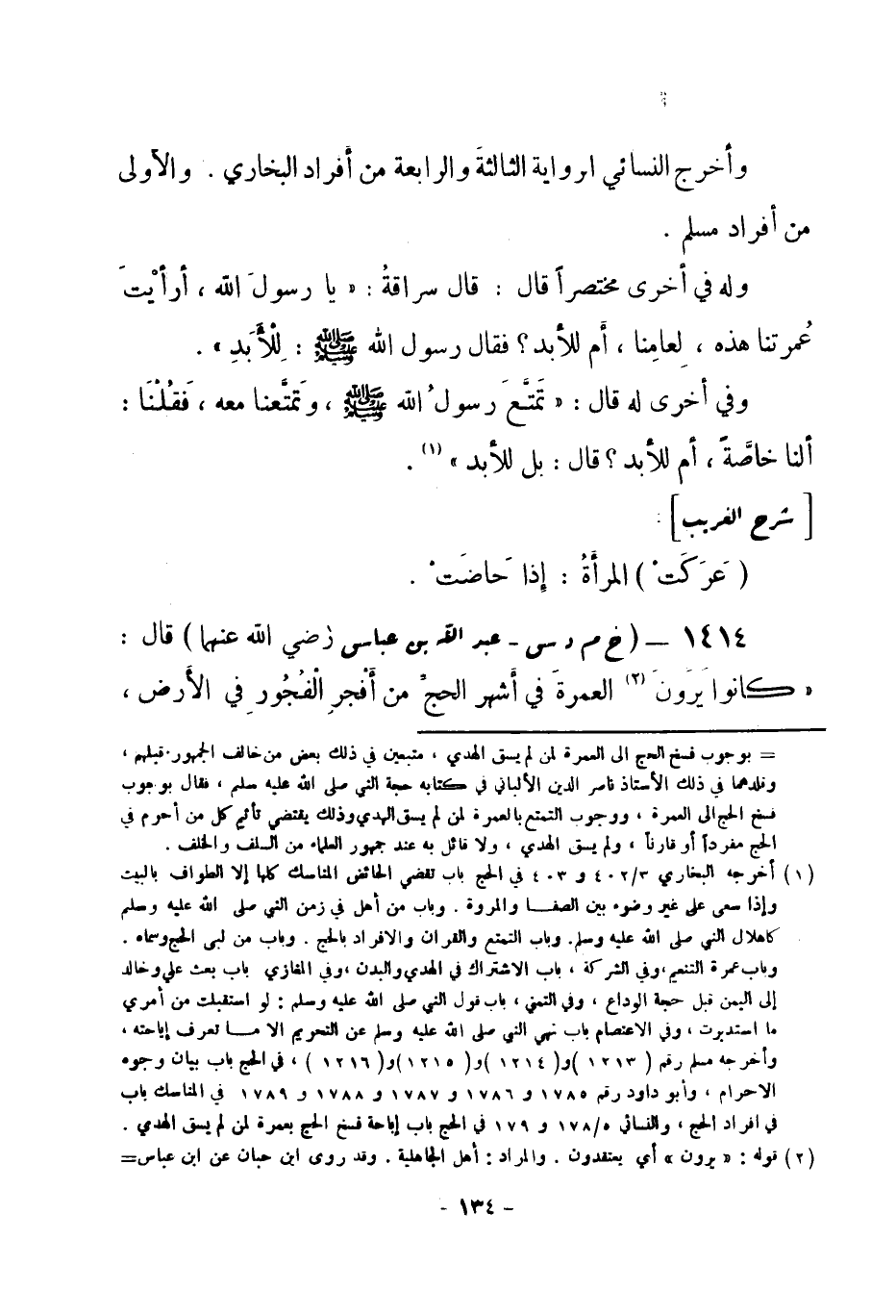 (¬4) أخرجه البخاري 3 / 337 و 338 في الحج، باب التمتع والقران والإفراد بالحج وفسخ الحج لمن لم يكن معه هدي، وفي فضائل أصحاب النبي صلى الله عليه وسلم، باب أيام الجاهلية، وأخرجه مسلم رقم (1240) و (1241) في الحج، باب جواز العمرة في أشهر الحج، وأبو داود رقم (1987) في الحج، باب العمرة، ورقم (1792) في المناسك، باب في إفراد الحج، والنسائي 5 / 180 و 181 و 201 و 202 في الحج، باب الوقت الذي وافى فيه النبي صلى الله عليه وسلم مكة، وباب إباحة فسخ الحج بعمرة لمن لم يسق الهدي، وأخرجه أيضاً أحمد في مسنده 1 / 252.