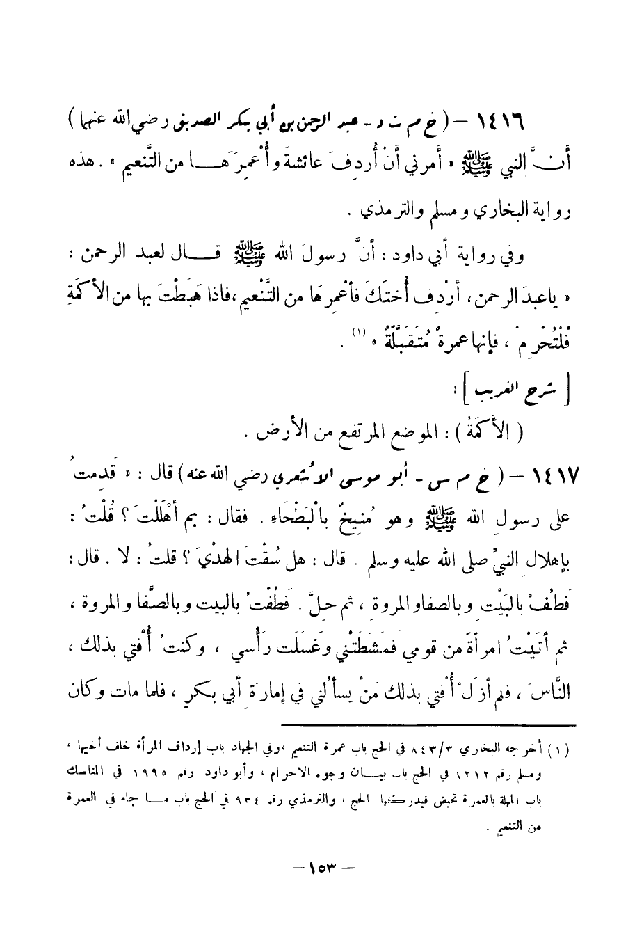 1416 - (خ م ت د) عبد الرحمن بن أبي بكر الصديق - رضي الله عنهما- أنَّ النبي -صلى الله عليه وسلم-: «أمرني أَنْ أردِفَ عائشةَ وأُعْمِرَهَا من التَّنعيم» . هذه رواية البخاري ومسلم والترمذي.