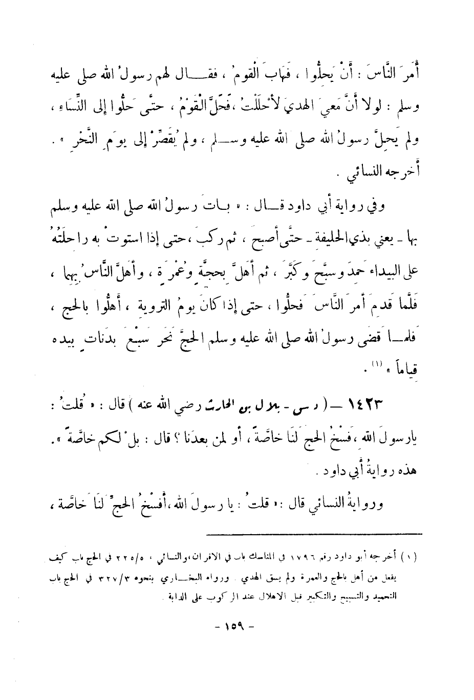 1423 - (د س) بلال بن الحارث - رضي الله عنه - قال: «قُلتُ: يا رسولَ اللهِ، فَسْخُ الحج لنَا خاصَّة، أو لمن بعدَنا؟ قال: بلْ لكم خاصَّة» . هذه روايةُ أبي داود.