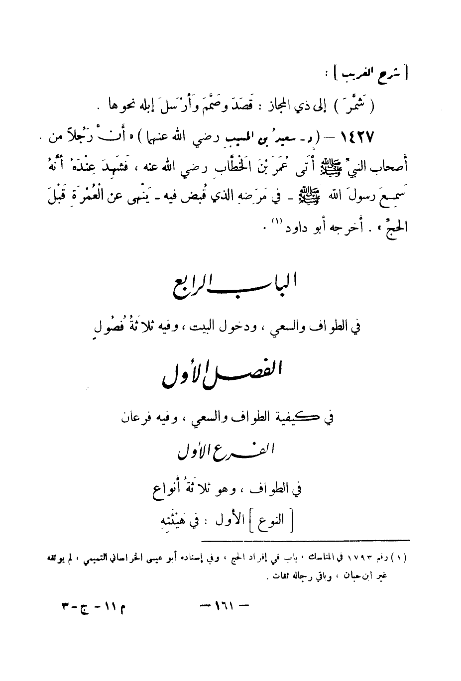 1427 - (د) سعيد بن المسيب - رضي الله عنهما -: «أنَّ رَجُلاً من أصحاب النبيِّ -صلى الله عليه وسلم- أتى عُمَرَ بْنَ الخَطَّابِ -رضي الله عنه -، فَشَهِدَ عِنْدَهُ أَنَّهُ سَمِعَ رسولَ اللهِ -صلى الله عليه وسلم- في مَرَضِهِ الذي قُبِضَ فيه - يَنْهى عن الْعُمْرَةِ قَبْلَ الحَجِّ» . أخرجه أبو داود (¬1) .