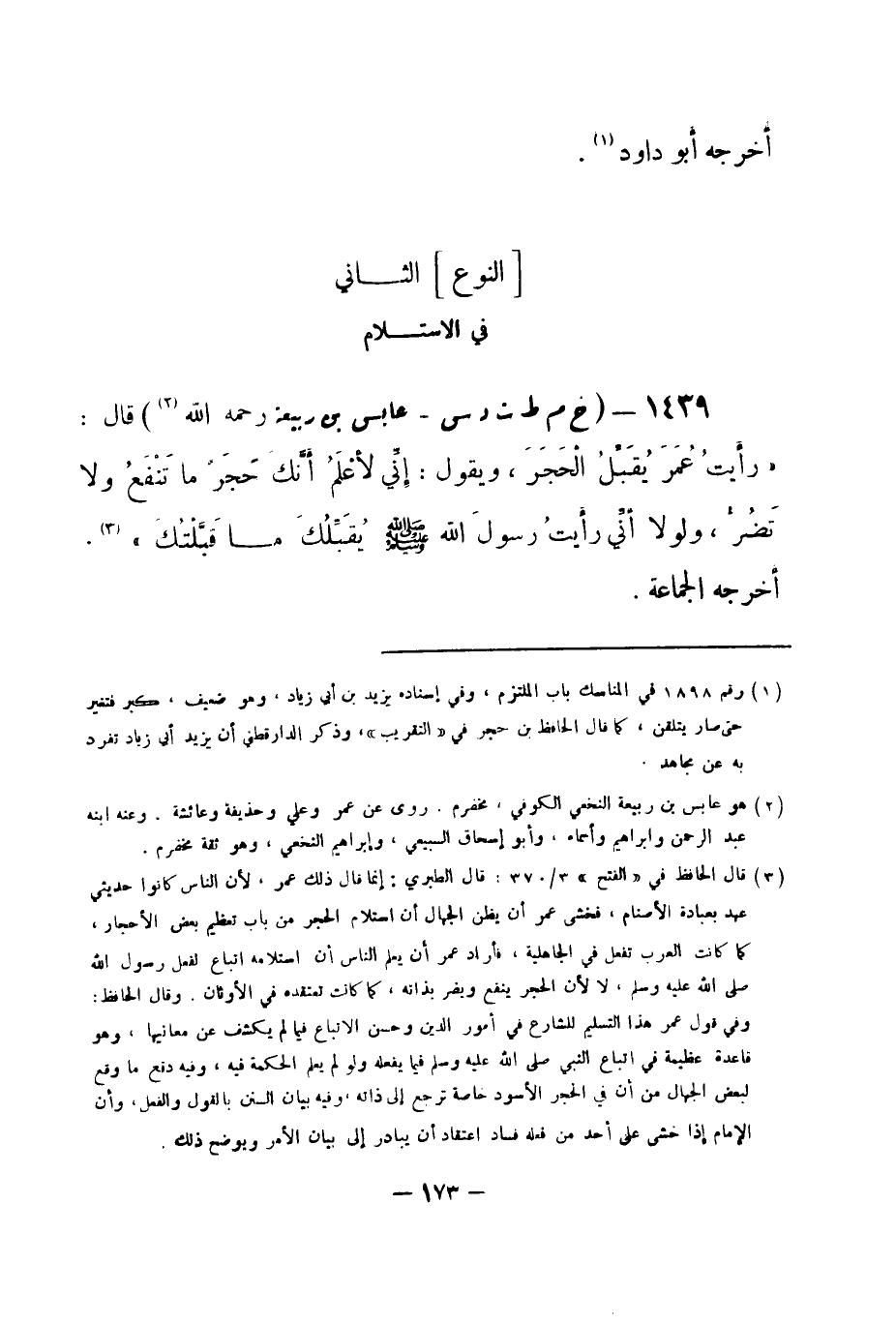 1439 - (خ م ط ت د س) عابس بن ربيعة -رحمه الله (¬1) - قال: «رأَيتُ عُمَرَ يُقَبِّلُ الْحَجَرَ، ويقول: إنِّي لأعْلَمُ أنَّكَ حَجَرٌ ما تَنْفَعُ ولا تَضُرُّ، ولولا أنِّي رأَيتُ رسولَ الله -صلى الله عليه وسلم- يُقَبِّلُكَ ما قَبَّلْتُكَ» (¬2) . أخرجه الجماعة. -[174]-