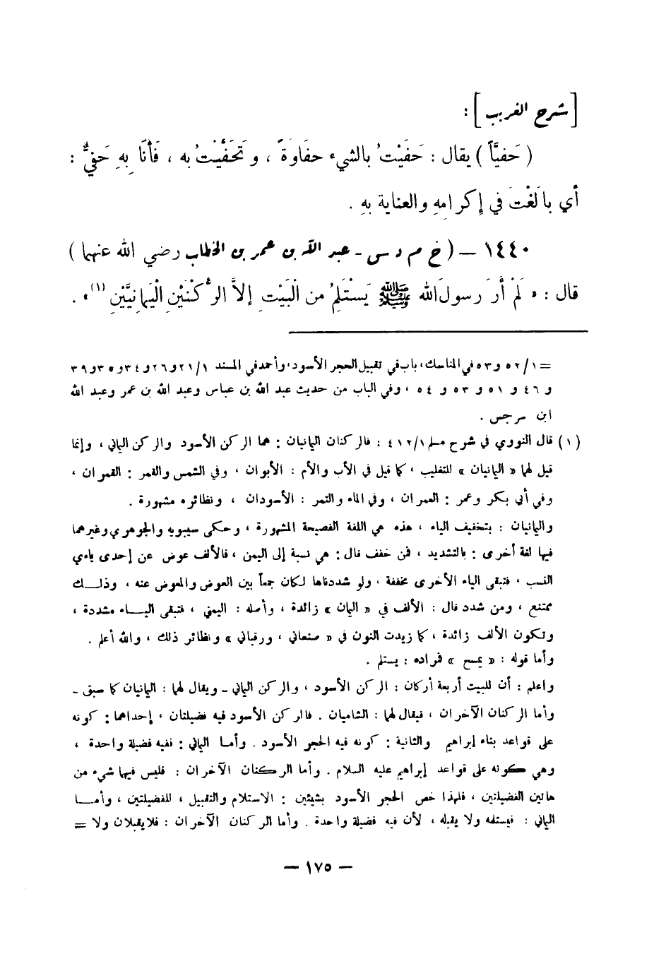 1440 - (خ م د س) عبد الله بن عمر بن الخطاب -رضي الله عنهما- قال: «لَمْ أَرَ رسولَ الله -صلى الله عليه وسلم- يَسْتَلِمُ من الْبَيْت إلا الرُّكْنَيْنِ الْيَمانِيَّيْنِ (¬1) » . -[176]-