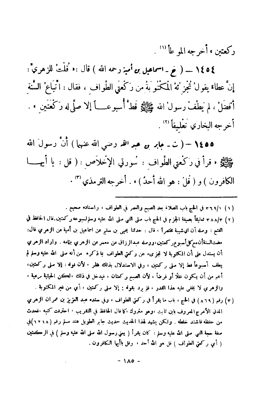 1454 - (خ) إسماعيل بن أمية -رحمه الله- قال: «قُلْتُ للزهريِّ: إنَّ عطاء يقولُ تُجْزِئُهُ الْمكْتُوبَةُ من رَكْعتَي الطَّوافِ، فقال: اتِّبَاعُ السُّنةِ أَفْضَلُ، لم يَطُفْ رسولُ الله -صلى الله عليه وسلم- قَطُّ أُسبوعاً إلا صلَّى له رَكْعَتَينِ» . أخرجه البخاري تعليقاً (¬1) .