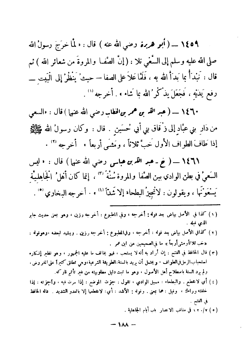 1461 - (خ) عبد الله بن عباس -رضي الله عنهما- قال: «ليس السَّعيُ في بطن الوادي بين الصَّفا والمروة سُنَّةً (¬1) ، إنما كان أهْلُ الْجَاهِليَّةِ يَسْعَوْنَها، ويقولون: لا نُجِيزُ البطحاءَ إلا شَدَّاً (¬2) » . أخرجه البخاري (¬3) . -[189]-