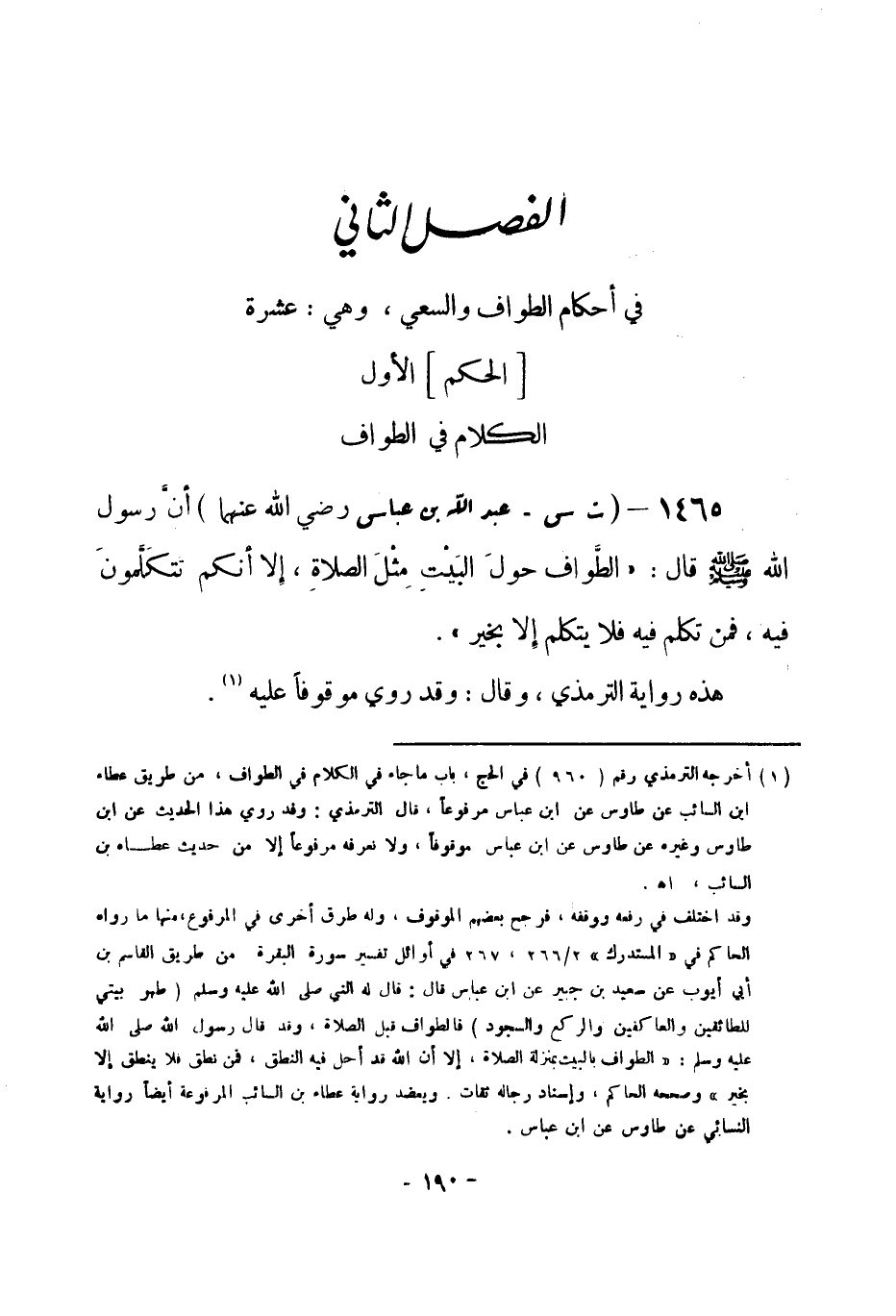 1465 - (ت س) عبد الله بن عباس -رضي الله عنهما- أنَّ رسول الله -صلى الله عليه وسلم- قال: «الطَّواف حولَ البَيْتِ مِثْلَ الصلاةِ، إلا أنكم تتكَلَّمونَ فيه، فمن تكلم فيه فلا يتكلم إلا بخير» . هذه رواية الترمذي، وقال: وقد روي موقوفاً عليه (¬1) . -[191]-