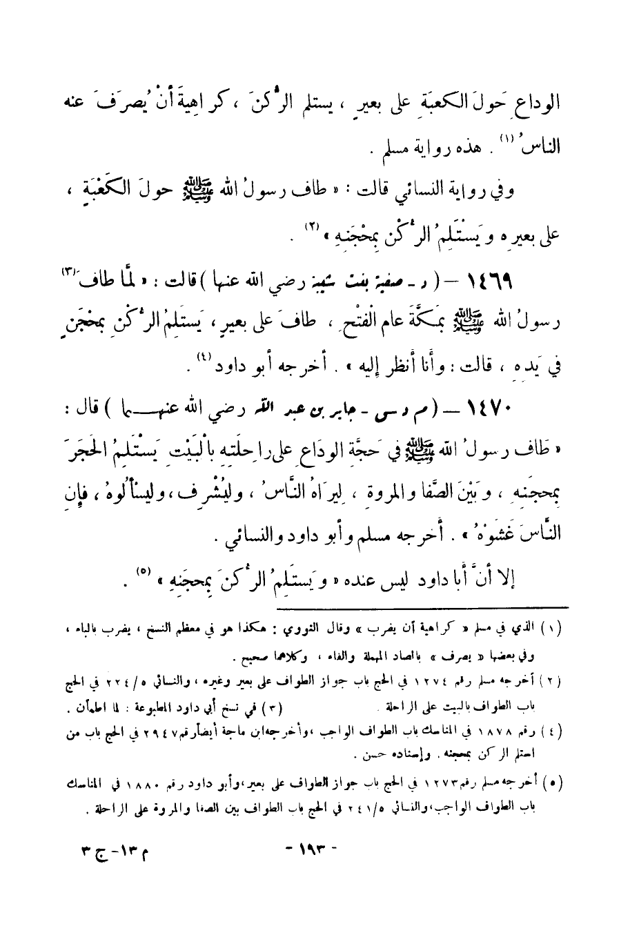 1470 - (م د س) جابر بن عبد الله -رضي الله عنهما- قال: «طاف رسولُ الله -صلى الله عليه وسلم- في حَجَّةِ الودَاعِ على راحِلَتِهِ بالْبَيْتِ يَسْتَلِمُ الحجَرَ بمحجنَهِ، وبَيْنَ الصَّفا والمروة، لِيرَاهُ النَّاسُ، وليُشْرِف، وليسألُوهُ، فإن النَّاسَ غَشَوْهُ» . أخرجه مسلم وأبو داود والنسائي.